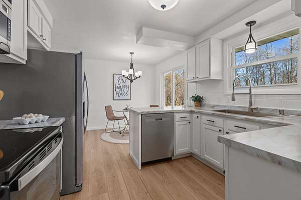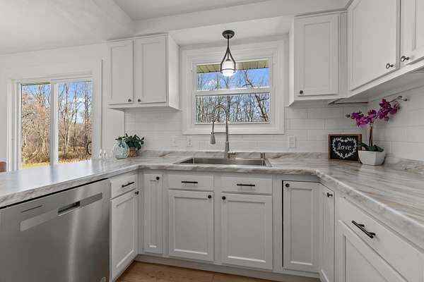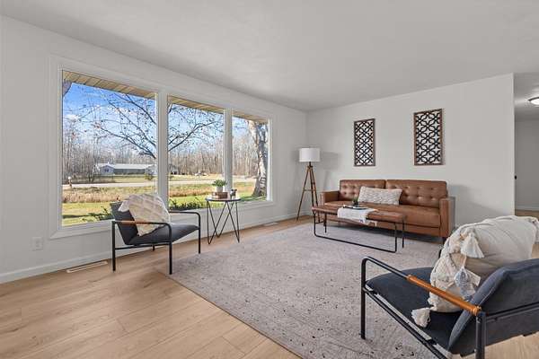 Beautifully remodeled ranch on approx. 2 acres with its own private pond. Updated top to bottom within the last year, this move-in-ready home features all new windows, roof, new kitchen & appliances, and partially finished lower level. Property has 3 bedrooms, 2 full baths, and an attached 2-car garage. Incredible storage with a detached garage approx 39x24 and a 30x24 metal-roofed garage. Parcel to be surveyed to reflect approx. 2 acres at seller's expense. Portion of land may be in MFL; updated info to come. Entire parce w/40 acres available for $575,000. Do not walk land without permission-active hunters may be present. lower level square foot approximate and buyer to measure for accuracy in LL.