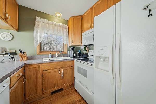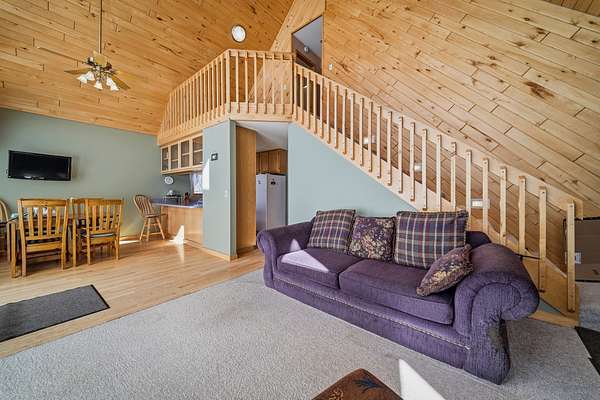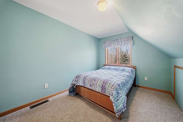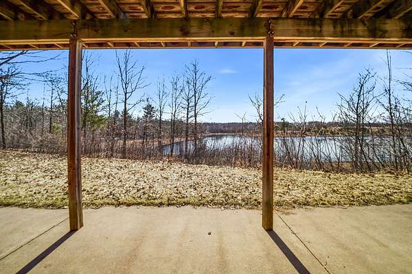 Striking waterfront A-frame set on 10.98 acres, offering a rare combination of privacy, usable land, and scenic lake views. With 4 bedrooms and multiple bathrooms, the home provides a flexible layout suited for a variety of living arrangements. The walkout lower level includes a second kitchen, ideal for guests, extended stays, or multi-generational living. A detached garage adds even more potential, already plumbed for a toilet and well-positioned for future conversion into a guest or in-law suite, while still offering ample storage. Designed to take full advantage of the setting, the home features a large deck overlooking the water and an expansive yard. The property also includes a fenced garden area, established fruit trees, and plenty of space to enjoy the outdoors. Located next to a bird sanctuary, the property attracts a wide range of wildlife, with frequent sightings right from your own yard. The acreage also offers excellent recreational use, including deer hunting. A unique opportunity to own a waterfront A-frame with acreage, lake views, and versatile living space in a naturally private setting.
