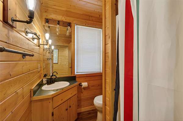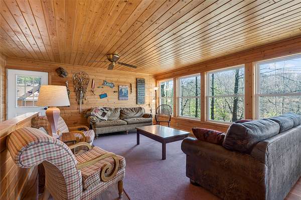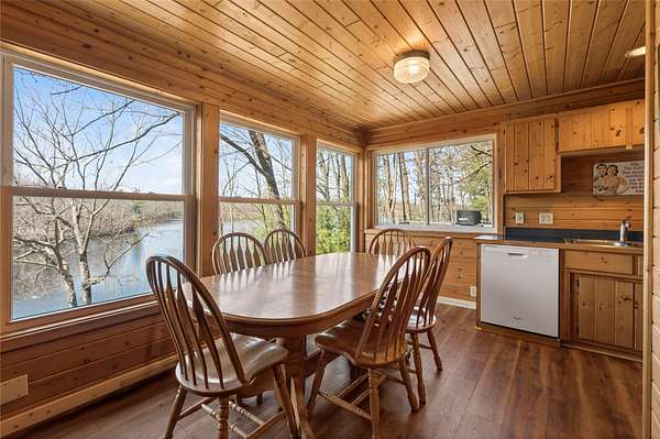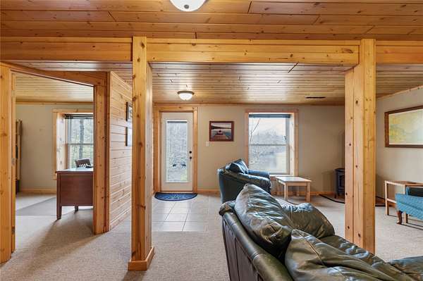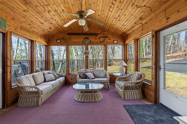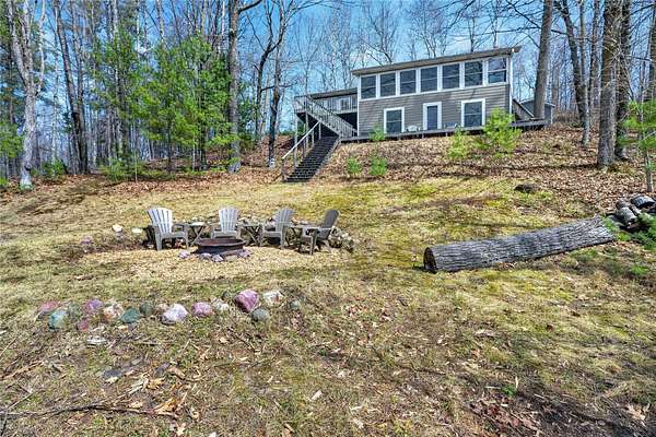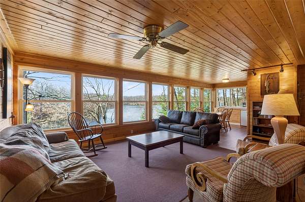 Amazing opportunity to own a cabin on two lots with 200 feet of frontage on Balsam Lake, offering exceptional privacy and a true Up North setting. Surrounded by mature trees, this property provides a peaceful retreat with stunning lake views and classic Northwoods charm. The inviting cabin features a free-flowing layout with a wall of windows overlooking the lake, filling the home with natural light, along with new luxury vinyl plank flooring, new carpet, and three main-level bedrooms. The walkout lower level adds a cozy family room with fireplace, an additional bedroom, and a flexible den or storage space. Enjoy the 3-season porch or relax on the lakeside decks, then gather around the firepit under the stars. A low-maintenance exterior includes a newer roof, siding, and vinyl windows. Balsam Lake connects to Red Cedar and Hemlock Lakes for miles of boating, recreation, and excellent fishing, with ATV and snowmobile trails nearby-making this the perfect year-round getaway. Most furnishings included, see list for full details.
