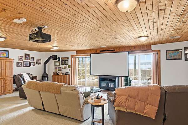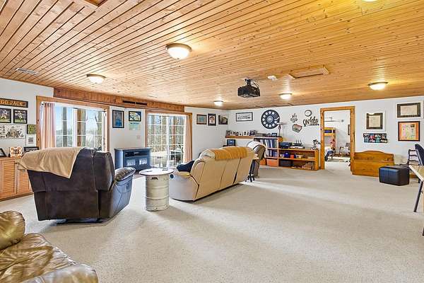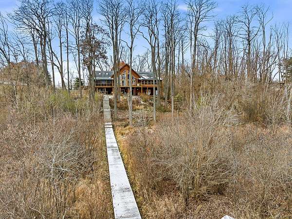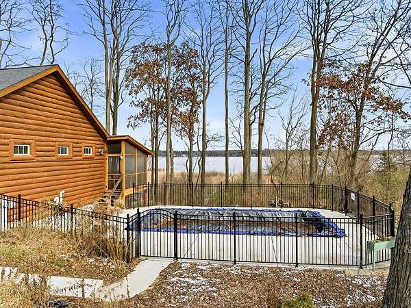 Spectacular estate set in the woods on 7 acres with 300 feet of frontage on Spring fed Lake Ripley. Custom built log home overlooking tranquil marshland with stunning views. Take in the sounds of nature as you walk along the board walk to your private pier. Open floor plan with vaulted ceilings & wide plank flooring, 4 bedrooms, 4 baths, 3 season room, screened porch, floor to ceiling stone fireplace in great room to keep you warm & cozy during the cooler months, nice main level deck with tiki bar, walkout lower level, inground pool, pickleball court, & an extra outbuilding/garage with 3+ stalls for all those lake and pool toys. Spacious kitchen with two large islands, beautiful knotty cherry cabinets, granite & quartz counter tops, walk-in pantry, & SS appliances. Nice size primary suite