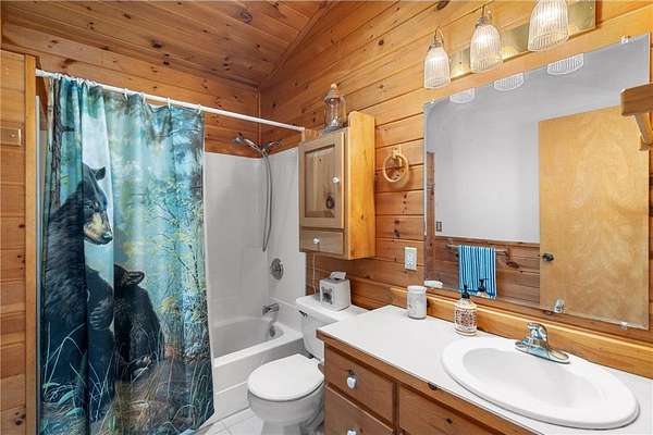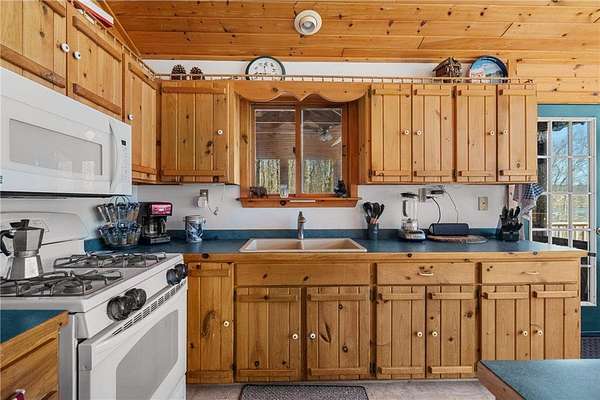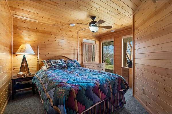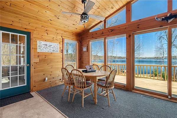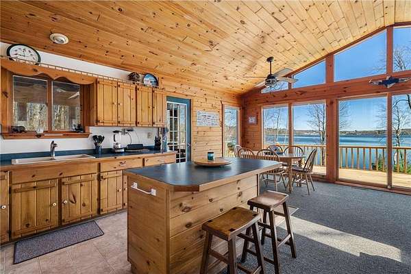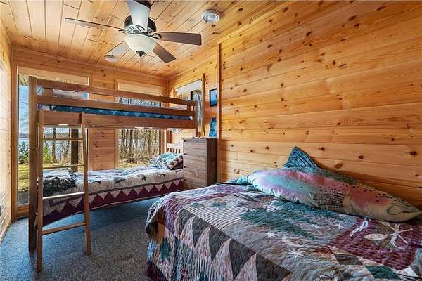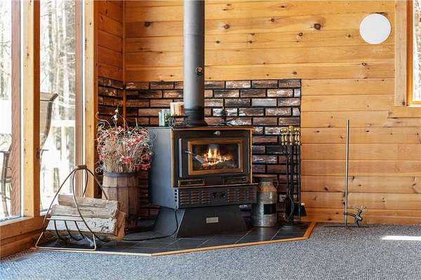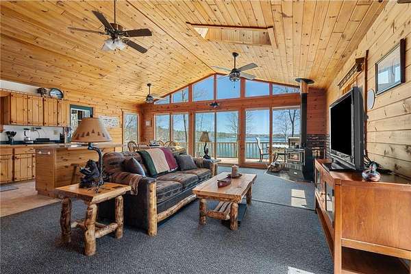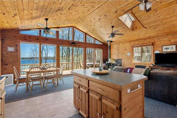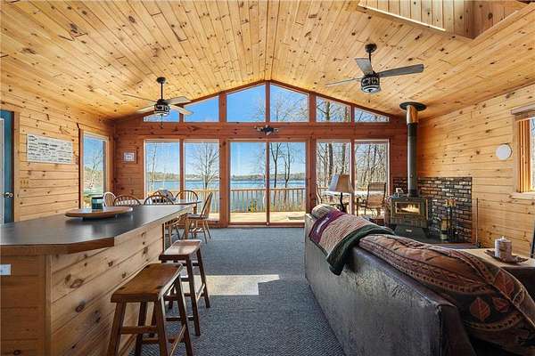 - The large lot sits on a quiet dead-end road with a usable backyard that’s easy to maintain. Enjoy beautiful sunrises from the open main level, huge lake-facing deck, or screened-in porch. Inside, the cabin showcases beautiful pine woodwork, an open layout perfect for gathering, and a thoughtfully updated lower level. A cozy fireplace with electric blower warms the main level, and you can adjust the heat or A/C remotely from your smartphone.