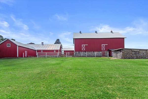 Welcome to the iconic Germer Farm: a rare opportunity to own a piece of Hustisford history on 250 ft of lake frontage. Tucked away on its own peninsula, this legacy property is a true countryside treasure. With its classic red barns, picturesque silos, and sweeping views of Wisconsin farmland, Germer Farm has long been a local landmark. Whether you're dreaming of hobby farming, establishing a homestead, or simply savoring peaceful country-lakeside living, this property offers the space and charm to make it possible. The main farmhouse is rich with rustic character, offering sun-soaked rooms, a welcoming porch, and vintage details throughout. Outbuildings provide endless possibilities for livestock, workshops, or equipment storage. Located just minutes from Hustisford town center.