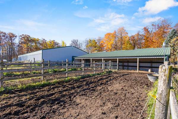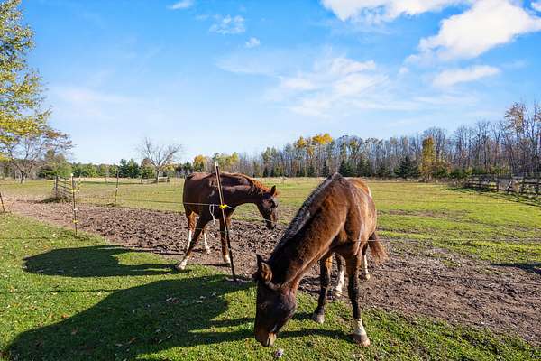Outside is a dream setup for horse lovers and outdoorsmen alike: a horse barn, indoor riding arena, fenced pasture, two ponds, and three hunting stands with excellent hunting right out your back door. The partially finished lower level adds extra living space plus a workshop.