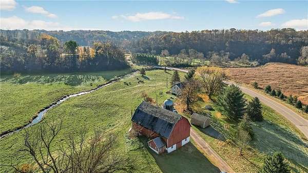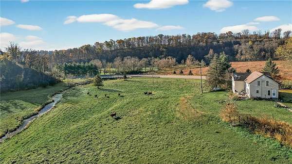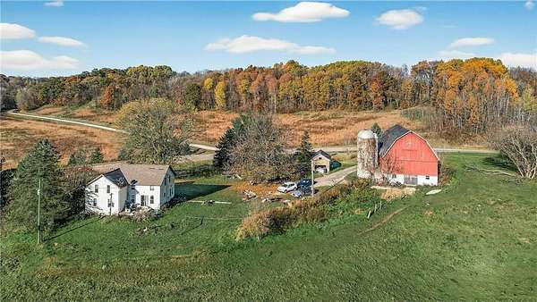 Est $3,930/moNew Survey to be completed to be approx 46 acres. Over 2100 feet of frontage of the Trimbelle River that runs through the entire property. The Trimbelle Recreation Area of 31 acres borders the north property line. House and Barn are in need of some work. Great Views, some woods and mature trees, pasture areas with electric fencing as well.