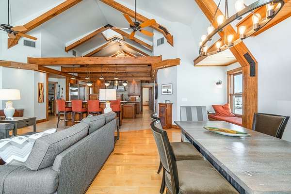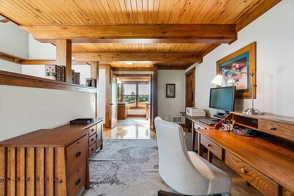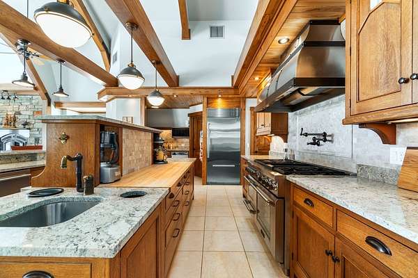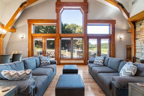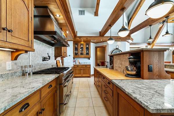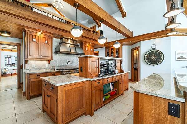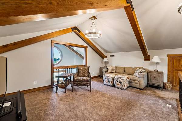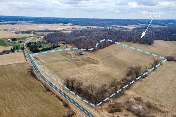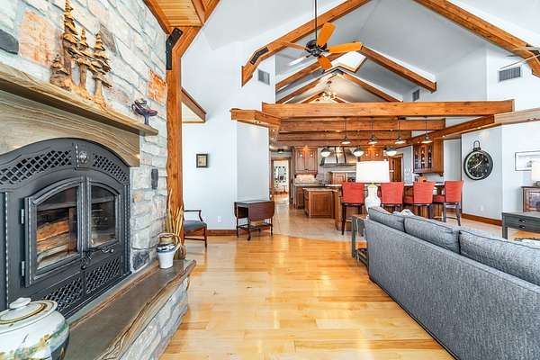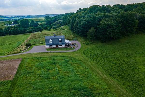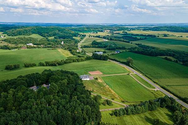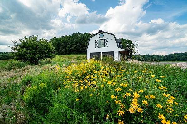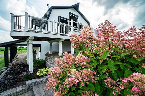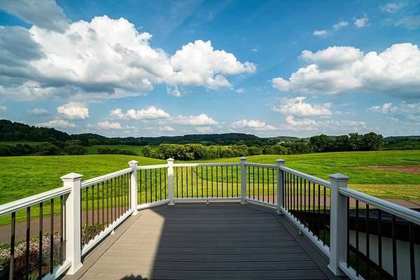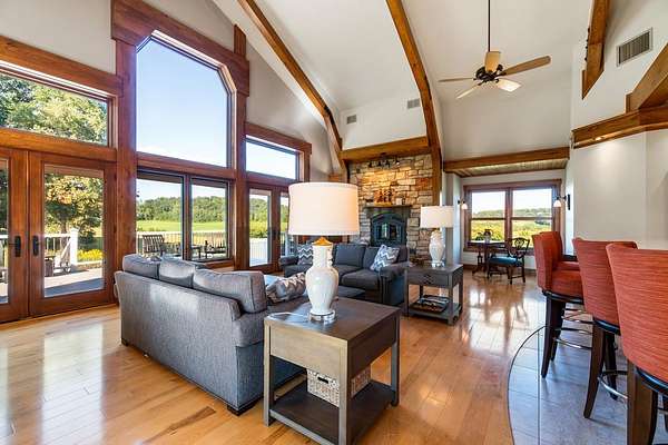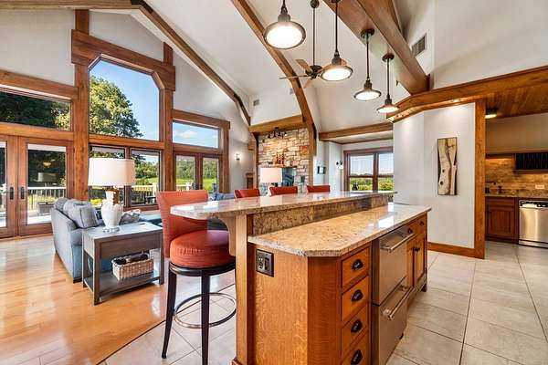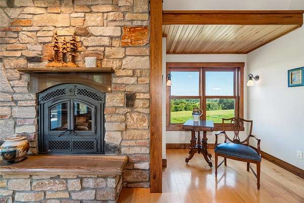 23 acres w/60 more acres available, wooded lot and hunting! This home is designed to impress! 18' ceilings with open concept kitchen, dining, & living room with custom built wood beams & window trim in solid hickory & cabinets in quarter-sawn oak, giving warmth to the home. Chef's kitchen is a dream, featuring granite countertops, high-end appliances, built-in espresso machine, & extensive storage unique design keeps clean up out of sight; separate spaces for chef (3 ovens) & baker (2 ovens) to create meals. Gorgeous stone wood burning fireplace. Glass accents & unique light fixtures add character & charm. Huge private owner's suite has two walk-in closets, dressing area, cozy den & luxurious ensuite. Lower level offers additional privacy, featuring lg bedroom, sitting area, kitchenette & bathroom - perfect for guests or extended family. The tiered deck provides a fantastic space for extending entertaining to the outdoors. Over 23 acres of rolling hills with wonderful views & sunsets!