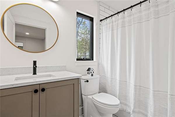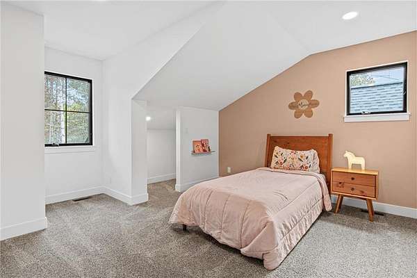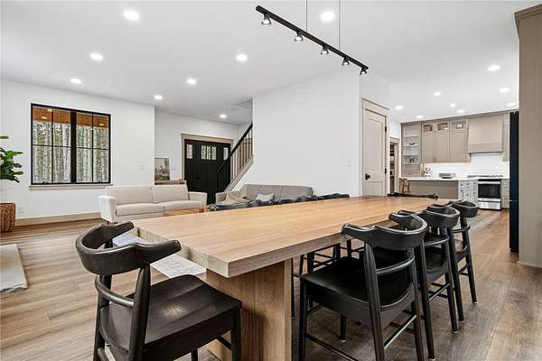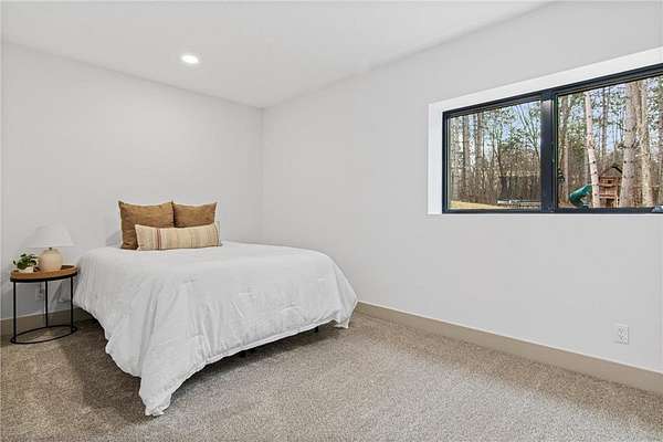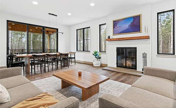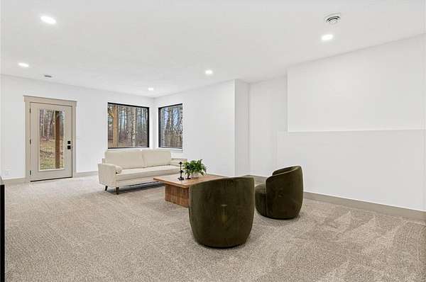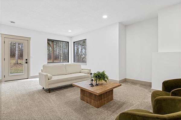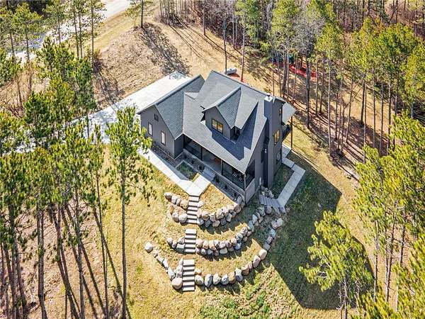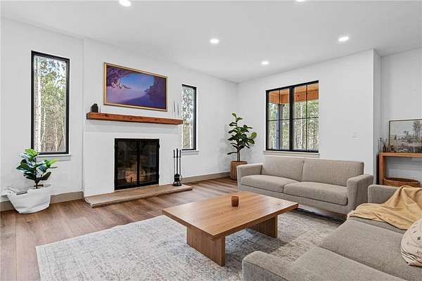 A winding drive leads to the two-story home, where an inviting front porch with a cedar-lined ceiling sets a warm, welcoming tone. The home is positioned among established landscaping, boulder accents, and wooded views, with a newly installed concrete driveway and extensive, thoughtfully designed landscaping further enhancing the setting. Striking black-framed windows add a bold, modern edge to the home’s exterior. Inside, large windows bring in natural light, highlighting simple architectural lines, warm finishes, and 9-foot ceilings that give the home an open, comfortable feel.