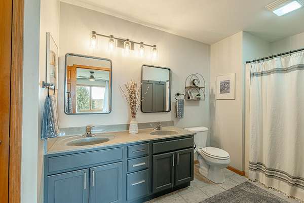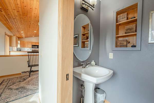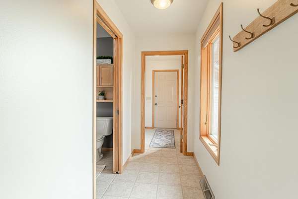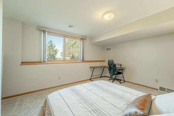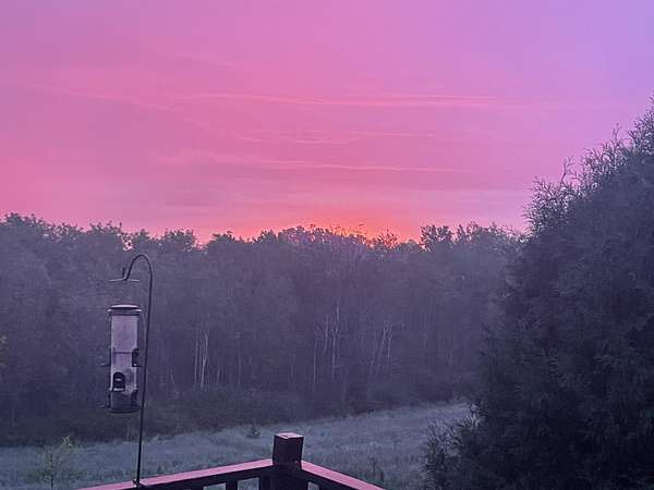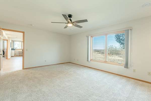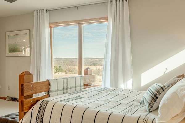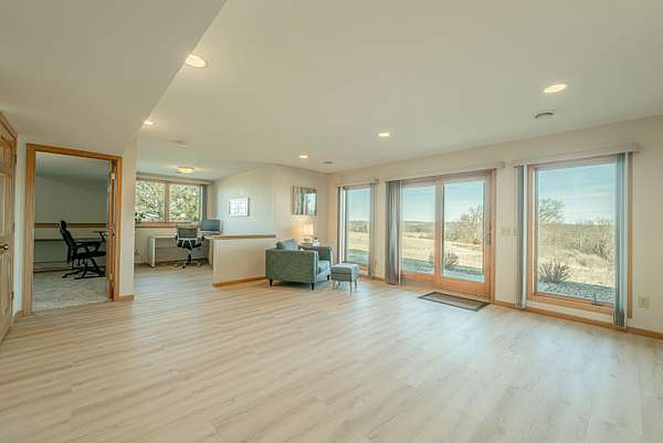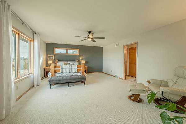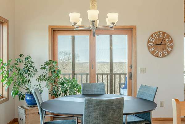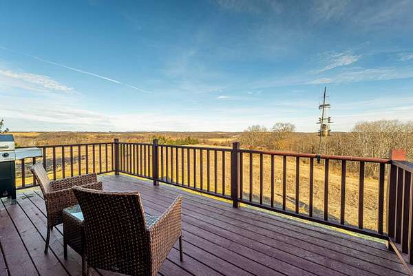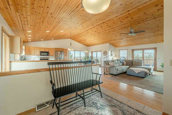 Blue Vista Ranch--where refined comfort meets peaceful countryside views where you can see for miles! From the moment you step inside, you'll be drawn to the open-concept living, dining & kitchen accented by flowing hardwood floors, warm knotty pine cathedral ceiling and windows galore. New quartz countertops pair beautifully with abundant cabinetry, creating a space ideal for everyday living and entertaining alike. Unwind on the screened porch or deck overlooking the backyard. The serene main-floor suite offers a private bath and walk-in closet, plus convenient main-floor laundry. The walk-out lower level features a cozy family room, 2 additional bedrooms, full bath, and a bonus office or game area--perfect for guests or flexible living.