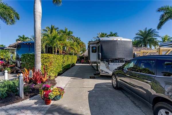 Lot 142 - Welcome to a private tropical retreat within the gates of the prestigious Naples Motorcoach Resort, a Class A-only, deeded motorcoach community in Naples, Florida. From the moment you arrive, you are welcomed by a lush, flower-lined entrance accented by stately Royal Palms, flowing fountains, and an elegant clubhouse-setting the tone for the exceptional lifestyle that awaits. This paved, turn-key motorcoach lot is beautifully landscaped and designed to offer both privacy and a true resort-style ambiance. Mature tropical plantings and manicured greenery surround the property, creating a serene and secluded setting. The tiki hut provides the perfect space for entertaining or relaxing, while enjoying the breathtaking view of your floral and rock garden. Owners enjoy access to an unparalleled array of resort amenities. Launch a kayak from the community boat ramp into Rookery Bay, or take advantage of boating access to nearby beaches and waterfront dining. The resort features a stunning infinity-edge pool, hot spa, fitness center, men's and ladies' saunas, pickleball courts, and a clubhouse with a catering kitchen available for owner use. Two additional satellite pool areas, each with hot spas, restrooms, and laundry facilities, add convenience throughout the community. A dedicated dog park ensures even four-legged residents feel at home. Naples Motorcoach Resort offers deeded, mortgage-eligible lots, making this property ideal for personal enjoyment, investment, or a 1031 exchange. Investors will appreciate the on-site, management-operated rental program, which handles marketing, bookings, payment processing, and applicable taxes-providing a seamless, hands-off ownership experience. Experience the tropical beauty, privacy, and resort lifestyle that define Naples Motorcoach Resort-your opportunity to own a turn-key slice of paradise in Southwest Florida.