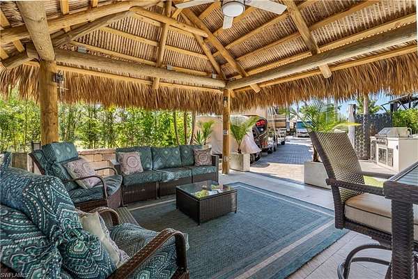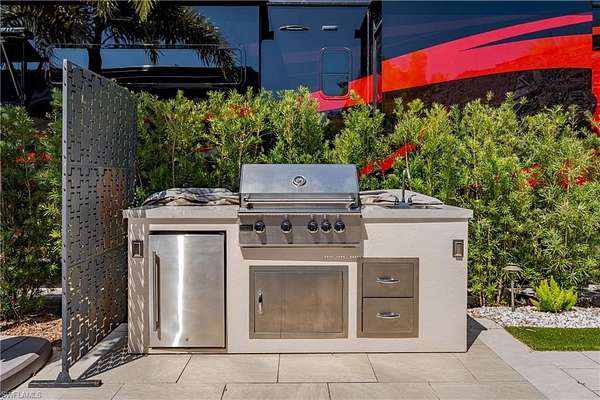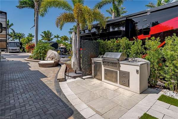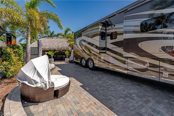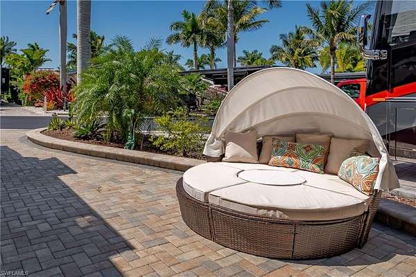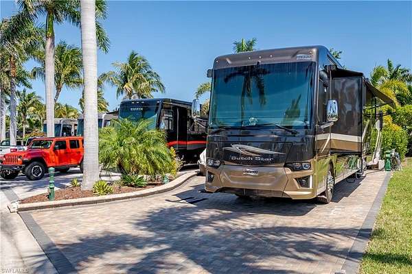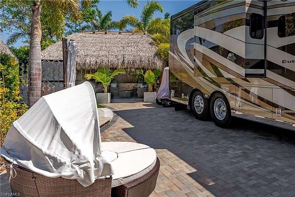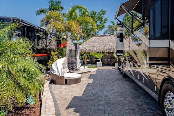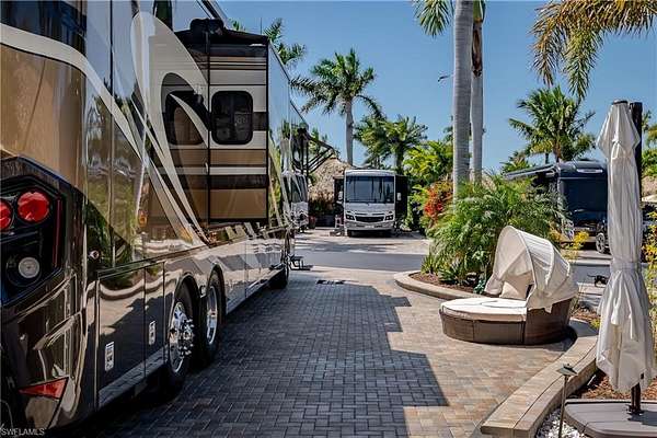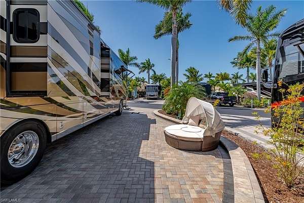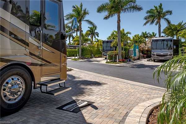 Lot 104 - You drive through the gates after admiring the beautiful flower and Royal Palm lined entry. As the gates swing open you are now facing a magnificent fountain in front of the clubhouse. You now turn and head to your slice of paradise, once again you cannot believe how beautiful this road is lined with Royal Palms... As you back into your beautiful fully paved lot, you admire the beautiful formal landscaping on your property. Now that you are settled in, you head back to your oversized tiki you decide to sit and relax with the beverage of your choice You plan to have dinner outside at your dining table tonight and listen to the water from your fountain. You have your own outdoor custom kitchen with both hot and cold water! You create a wonderful meal on your barbeque and thoroughly enjoy it at your table. You are so happy to be in paradise and enjoying your turn-key property. What shall you do tomorrow?? Perhaps take one of the community kayaks and launch from the boat ramp and go through Rookery Bay. Maybe you will buy a boat, how convenient would that be to launch and go to the beach or boat up to a restaurant for lunch or dinner from within the resort? Perhaps it is time to learn how to play pickleball and play on one of the three courts? Probably best to build up those muscles first in the fitness center and then sit in the sauna. So many options! Welcome to the magic that is Naples Motorcoach Resort. Naples Motorcoach Resort is a Class A only resort and boasts a beautiful infinity pool, hot spa, exercise room, men's and ladies saunas as well as a catering kitchen that owners can use. There are also two satellite pools with a hot spa, their own rest rooms and a laundry room. We can't forget your furry best friend, the resort even has a dog park! Special note to investors, looking for a place to invest or reinvest as a 1031 exchange? Look no further, own this piece of paradise and put it into the management run rental program. The rental program administration advertises, schedules renters, collects payment including applicable taxes/fees and sends you your portion. These deeded lots are mortgage eligible and great for a quick close.