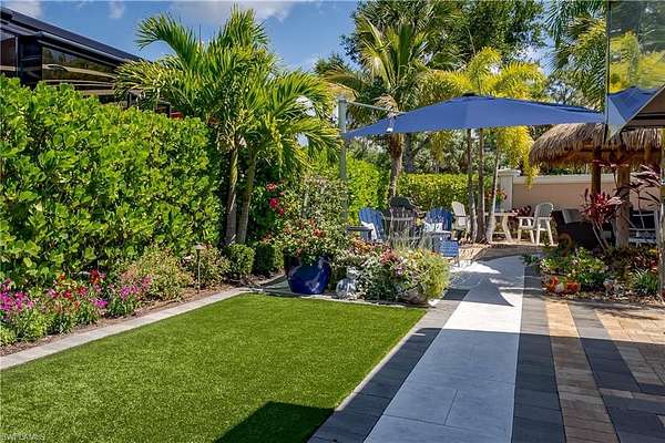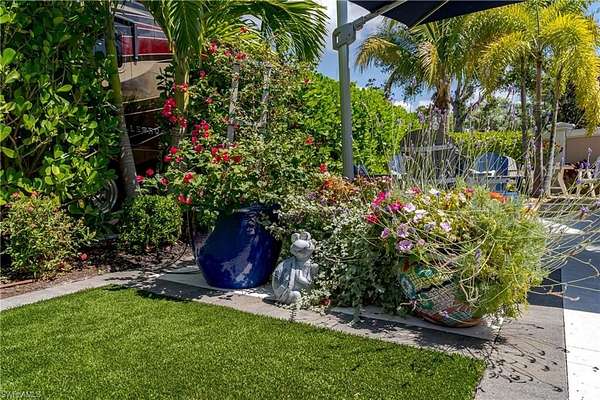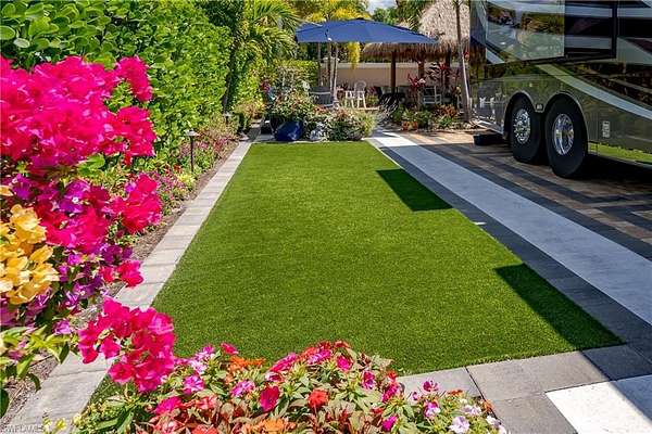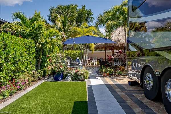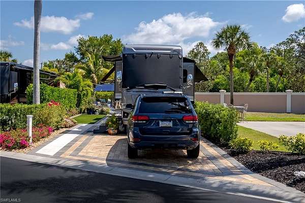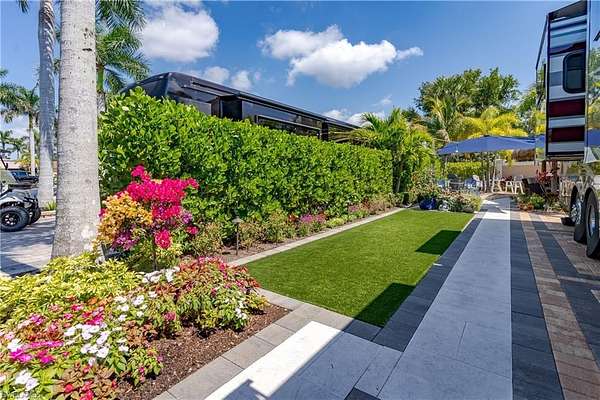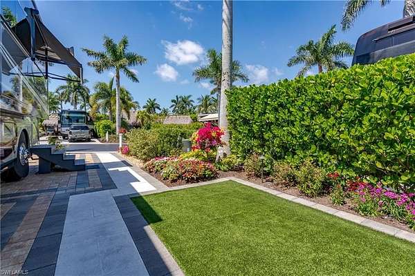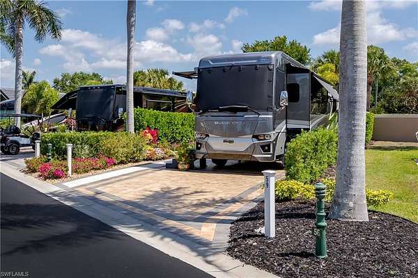 Lot 59 - You drive through the gates after admiring the beautiful flower and Royal Palm lined entry and the two fountains you passed have already welcomed you. As the gates swing open you are now facing an even more magnificent fountain in front of the clubhouse. You now turn and head to your slice of paradise, once again you cannot believe how beautiful this road is lined with Royal Palms... As you back into your beautiful fully paved lot, you admire the beautiful formal landscaping on your property. Wait, you even have a beautiful pet approved artificial grass area. No pet? Put your lawn chairs on it and enjoy the Southwest Florida sunshine. This property has it all. Now that you are settled in, you head back to your tiki and you decide to sit and relax with the beverage of your choice as you watch your favorite show. You plan to have dinner outside at your dining table tonight. You marvel at the privacy you have and contemplate potentially adding a water feature. But for now, you are so happy to be in paradise and enjoying your property. What shall you do tomorrow?? Perhaps take one of the community kayaks and launch from the boat ramp and go through Rookery Bay. Maybe you will buy a boat, how convenient would that be to launch and go to the beach or boat up to a restaurant for lunch or dinner from within the resort? Perhaps it is time to learn how to play pickleball and play on one of the three courts? Probably best to build up those muscles first in the fitness center and then sit in the sauna. So many options! Welcome to the magic that is Naples Motorcoach Resort. Naples Motorcoach Resort is a Class A only resort and boasts a beautiful infinity pool, hot spa, exercise room, men's and ladies saunas as well as a catering kitchen that owners can use. There are also two satellite pools with a hot spa, their own rest rooms and a laundry room. We can't forget your furry best friend, the resort even has a dog park! Special note to investors, looking for a place to invest or reinvest as a 1031 exchange? Look no further, own this piece of paradise and put it into the management run rental program. The rental program administration advertises, schedules renters, collects payment including applicable taxes/fees and sends you your portion. These deeded lots are mortgage eligible and great for a quick close.