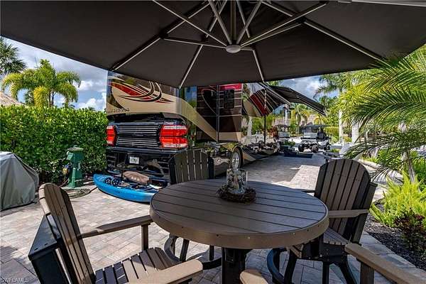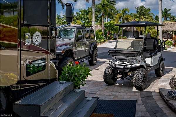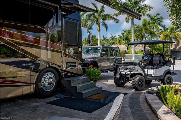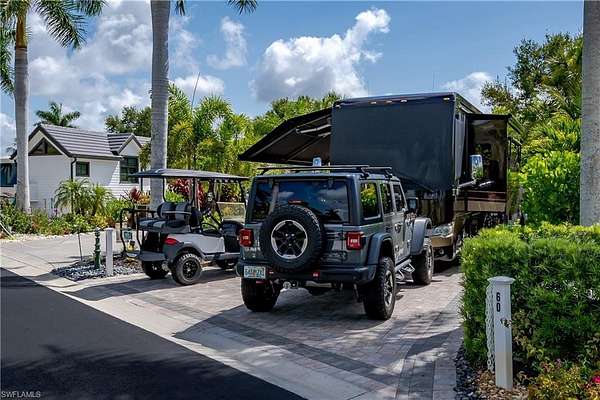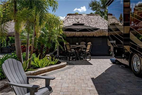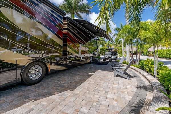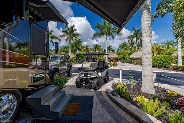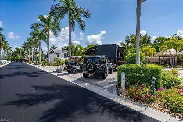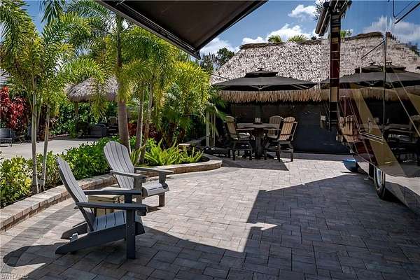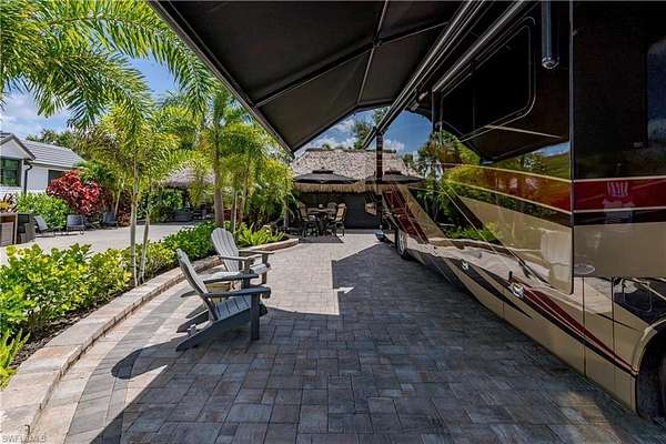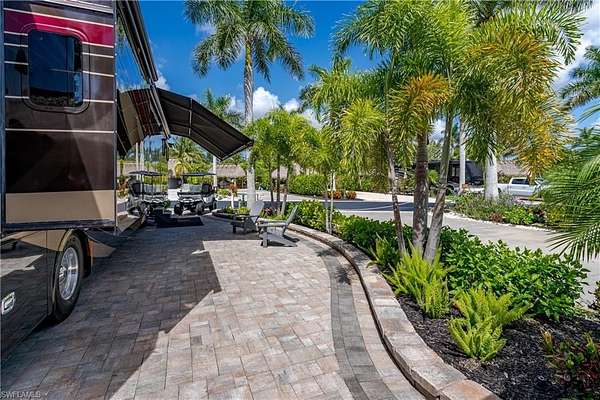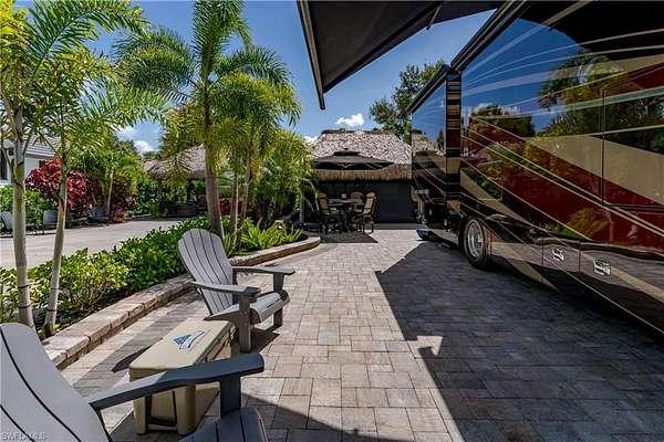 Lot 60 - You drive through the gates after admiring the beautiful flower and Royal Palm lined entry and the two fountains you passed have already welcomed you. As the gates swing open you are now facing an even more magnificent fountain in front of the clubhouse. You now turn and head to your slice of paradise, once again you cannot believe how beautiful this road is lined with Royal Palms... As you back into your beautiful fully paved lot, you admire the beautiful formal landscaping on your property. Now that you are settled in, you head back to your tiki and you decide to sit and relax with the beverage of your choice as you watch your favorite show. Once again you marvel at your landscaping and the privacy you have with the beautiful back wall. With screens that you can either have open or closed, your space under your tiki has all the benefits of a private room, bugs stay out, but you can still see through to admire your landscaping. As you are comfortably in your tiki with the sound of breezes, you look forward towards the front of your property and as dusk falls once again marvel at the beauty of it all and contemplate potentially adding a water feature. But for now, you are so happy to be in paradise and enjoying your property. What shall you do tomorrow?? Perhaps take one of the community kayaks and launch from the boat ramp and go through Rookery Bay. Maybe you will buy a boat, how convenient would that be to launch and go to the beach or boat up to a restaurant for lunch or dinner from within the resort? Perhaps it is time to learn how to play pickleball and play on one of the three courts? Probably best to build up those muscles first in the fitness center and then sit in the sauna. So many options! Welcome to the magic that is Naples Motorcoach Resort. Naples Motorcoach Resort is a Class A only resort and boasts a beautiful infinity pool, hot spa, exercise room, men's and ladies saunas as well as a catering kitchen that owners can use. There are also two satellite pools with a hot spa, their own rest rooms and a laundry room. We can't forget your furry best friend, the resort even has a dog park! Special note to investors, looking for a place to invest or reinvest as a 1031 exchange? Look no further, own this piece of paradise and put it into the management run rental program. The rental program administration advertises, schedules renters, collects payment including applicable taxes/fees and sends you your portion. These deeded lots are mortgage eligible and great for a quick close. In case you are interested, the lots on each side of this property are currently available as well. Have a friend or family member as a neighbor, or perhaps purchase for yourself to add space and build a large casita. Possibilities are endless!