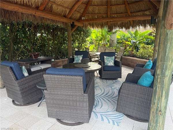 This turn-key lot is thoughtfully designed for outdoor living and relaxation. Lush tropical plants and formal landscaping surround the property, creating a serene and secluded setting. The oversized tiki is ideal for entertaining or unwinding with your favorite beverage. Enjoy alfresco dining at your outdoor fire table perfect for enjoying the quiet evenings in paradise.