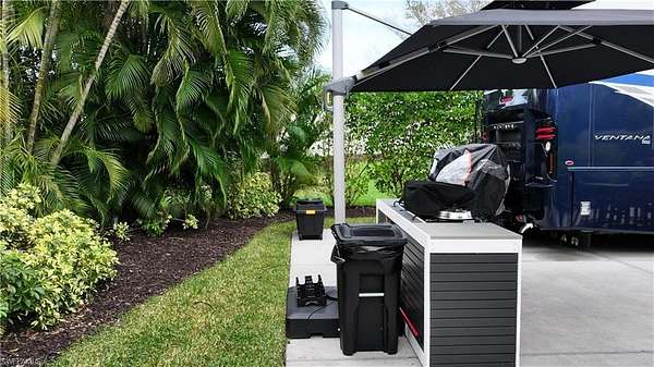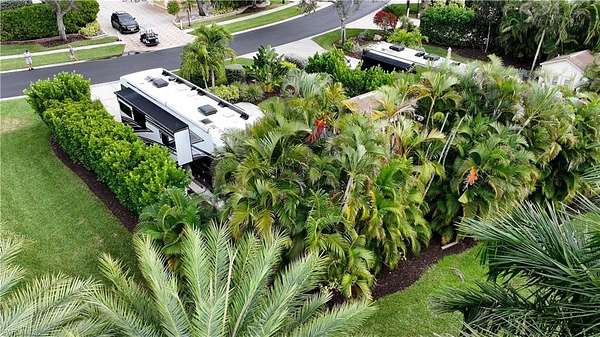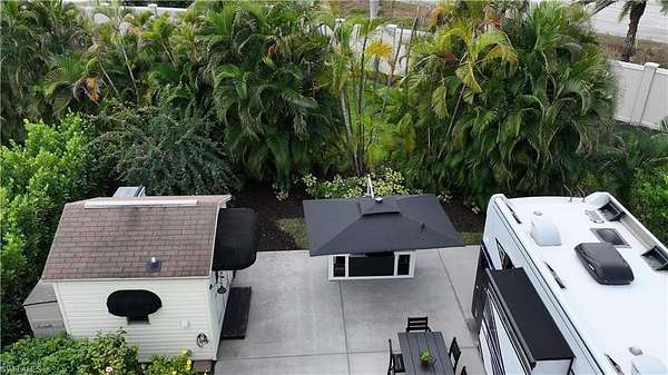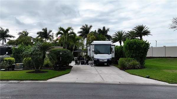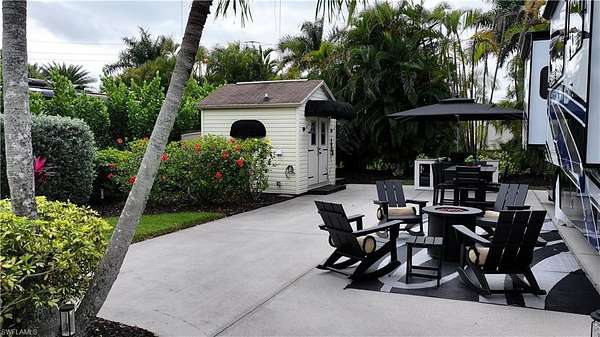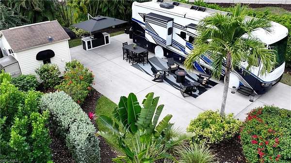 Welcome to 4628 Southern Breeze Drive in the prestigious Pelican Lake Motorcoach Resort, one of Naples' premier luxury motorcoach communities. Offered at $155,000, this beautifully landscaped over 4,500 sq ft lot provides privacy, comfort, and resort-style living at its finest. The north/east-facing orientation offers ideal sunlight throughout the day, while the lot is surrounded by a lush variety of tropical palms and plants, creating a serene and private outdoor retreat. With no neighbors to the north, enjoy enhanced privacy and peaceful views. The property features a fully finished accessory building, remodeled in 2025, perfect for entertaining, relaxing, or additional storage. The coated concrete slab offers durability and a clean, polished look for your motorcoach setup. This lot is being sold turnkey, with all Polywood-style outdoor furniture included, along with the umbrella and built-in grill, allowing you to immediately enjoy the Florida lifestyle with no additional expense. Pelican Lake Motorcoach Resort offers luxury amenities, a prime Naples location close to shopping, dining, and beaches, and an active social atmosphere. This is an exceptional opportunity to own a private, upgraded lot in one of Southwest Florida's most sought-after motorcoach resorts.