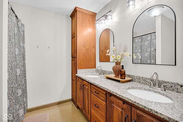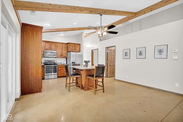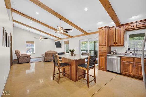 Feast your eyes on 7730 State Rd 46 E, in Nashville, Indiana, a single-family residence sitting pretty, prepare to be charmed! The living room is magic, with a beamed ceiling and a vaulted ceiling conspiring to create a space that feels both grand and cozy all at once. Imagine sinking into a comfy chair in your sunroom, the warm light streaming in as you contemplate the important questions in life, such as, "Should I have another cup of coffee?" The kitchen is ready for your culinary adventures, with a large kitchen island with granite countertops, offering plenty of room to chop, dice, and create your signature dishes, or simply to display your impressive collection of artisanal cheeses. The primary bathroom features a double vanity, so there's no need to fight for mirror space in the morning! With a sprawling 2-acre lot area and a delightful woods view, this property offers an abundance of outdoor living space, creating your very own private sanctuary. The open floor plan creates an airy, welcoming atmosphere, while the laundry room and walk-in closet add a touch of practicality to this attractive property. Did I forget to mention the heated floors....through the Whole house. There's also a tankless water heater for quick showers and laundry and the roomy 2 car garage to store cars or toys out of the weather. One. More. Thing, there's an RV hook up for any extra guests that might want to stay.