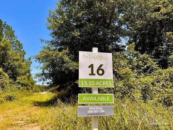 Discover the beauty of NatureWalk at Pond Creek, one of the most prestigious land communities in Northwest Florida. NatureWalk is nestled amidst pine tree forests, lush greenery, scattered oaks, and natural flowing creeks. The idealistic landscape is almost "untouched," providing privacy, peace, and serenity for each lot. Lot 16 is a large 15-acre parcel surrounded by hardwood buffers on the north and south-east sides. This natural buffer separates this unique property from the rest of the NatureWalk community. There is about a 1.5-acre cleared area designated for the future homesite. Come and enjoy a diverse array of vegetation, including mature pines, oaks, magnolia trees, and other trees that surround the spring and stream areas. ADDITIONAL COMMUNITY INFORMATION: NatureWalk at Pond Creek community was launched in 2023, and since then, this exclusive community has become a place that attracts buyers from all across the United States. The Owner's vision for this community is simple: Quality Family Living Centered Around Nature. Curved and paved roads, a distinctive community layout thoughtfully combined with Northwest Florida's natural beauty, high-end landscape features, common areas set in a scenic natural environment, and high-speed internet are all reasons for that. This unique community is situated on 653 acres of land, comprising 100 lots in total, and features homesites ranging from 2 to 15+ acres, including premium creek-front parcels. As of July 2025, close to 50 out of 100 parcels have been sold. LOCATION: Another aspect that makes this community very special is its location. NatureWalk at Pond Creek is conveniently located within a short drive of Publix, Big-Box stores, restaurants, and hospitals. Our community is centrally located for outdoor enthusiasts: from Blackwater River freshwater fishing and boating to our Gulf Coast, featuring the emerald blue waters of the Gulf of Mexico and beautiful beaches.