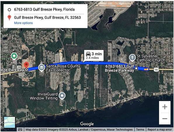 Just over two miles down Hwy 98 from the nearly completed new high school, this property could be a profitable location for any number of businesses, particularly those that cater to high school students among other things, such as a drive through coffee or smoothie shop. The property is also located within 2 miles of the Gulf Breeze Zoo and the Santa Rosa Annex. The property is about 3 miles east of the intersection of East Bay Blvd & US-98 and is about 5 miles west of the intersection of Hwy 87 & US-98. and 10 minutes to the tourist destination of Navarre Beach.