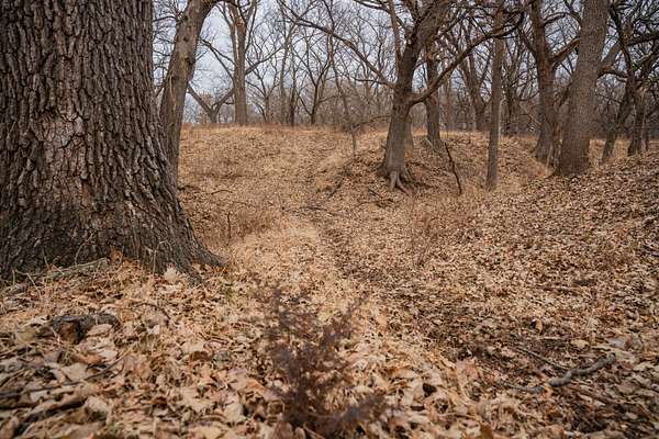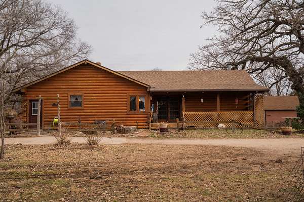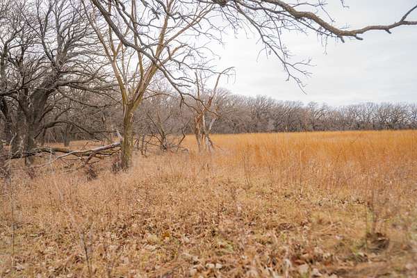 Elk Creek runs through the heart of this property, creating a beautiful timbered creek bottom with mature oak trees and excellent wildlife habitat. The land supports trophy whitetail deer, turkeys, and other game. Pasture on the north side and dryland cropland on the south provide income potential. A 3-bed, 2-bath log cabin and multiple outbuildings complete this versatile property.