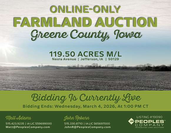 Greene County, Iowa Online Only Farmland Auction - Mark your calendars for Wednesday, March 4th, 2026! Peoples Company is pleased to present 119.50 acres m/l of high-quality Greene County, Iowa farmland located on the southeast side of Jefferson, Iowa.