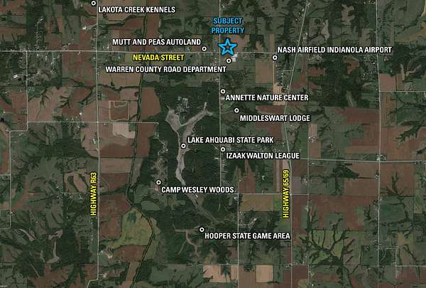 Nearby amenities and businesses include; Lake Ahquabi State Park, Nash Airfield, Warren County Road Department, Annette Nature Center, Middleswart Lodge, Izaak Walton League, Camp Wesley Woods, Hooper State Game Area, Mutt and Peas Autoland, Lakota Creek Kennels, and more.