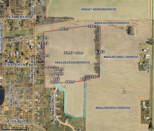 Approximately 32 acres of development land with a preliminary plat for 36 proposed residential lots, positioned as a continuation of the Prairie Trails subdivision. Located 4.5 miles from the new AWS campus in the Indiana Enterprise Center - a significant long-term investment in the area, supporting future growth and housing demand. Well and septic are required at this time, with potential for municipal water and sewer as infrastructure expands. An additional 11 fully engineered lots, not included in the 32 acres, may also be available, totaling 41.73-acres can be assembled at an additional cost.