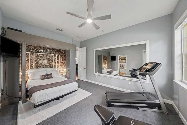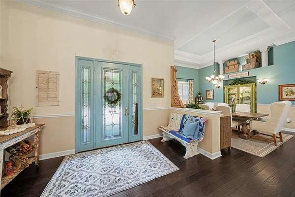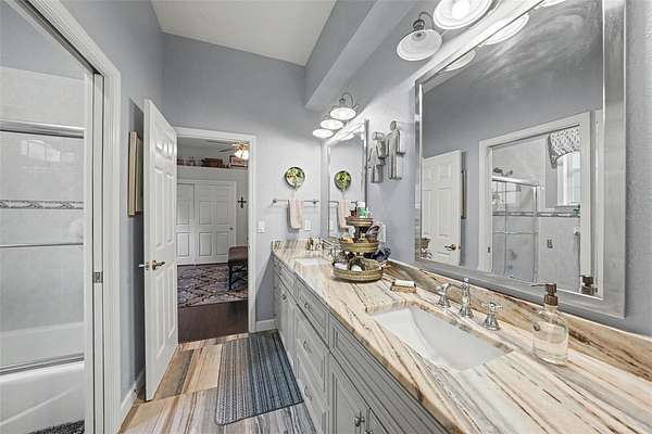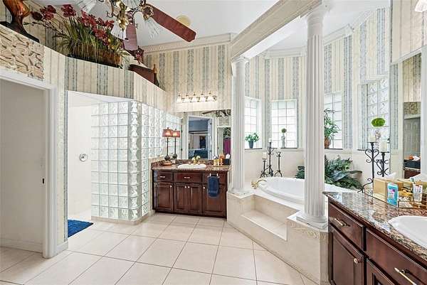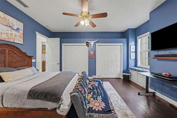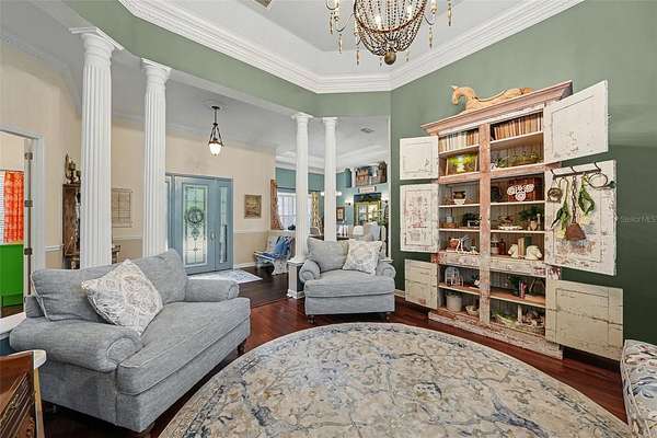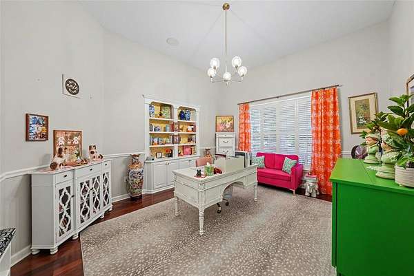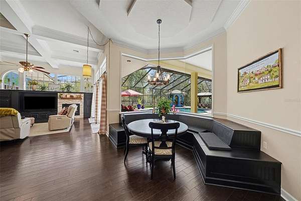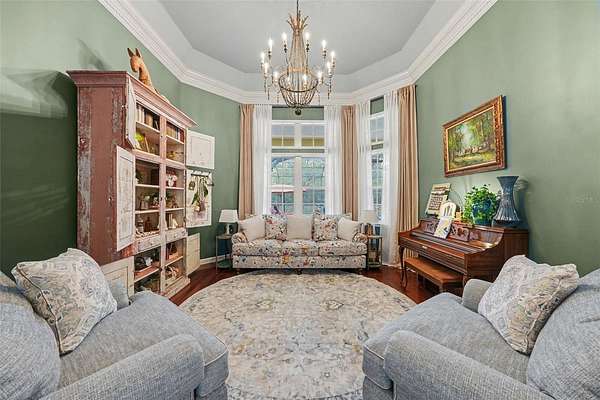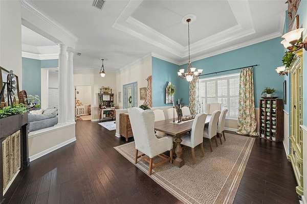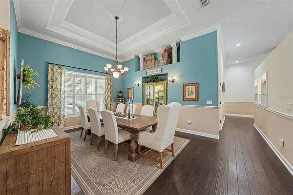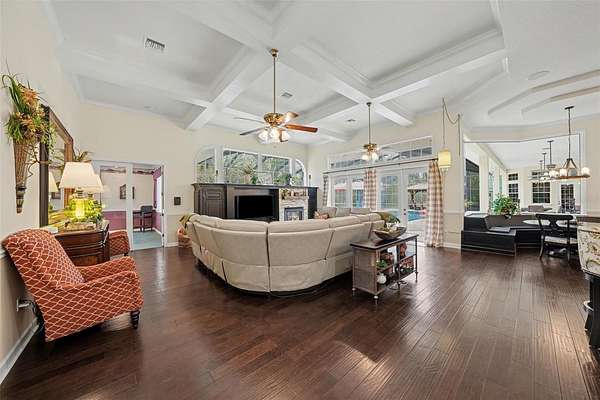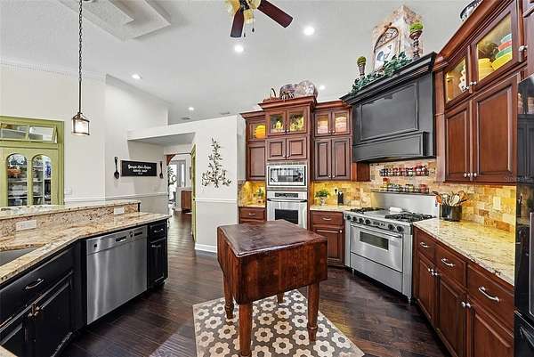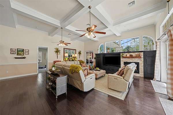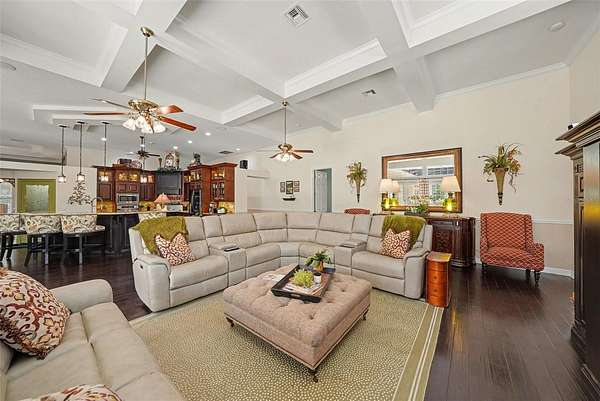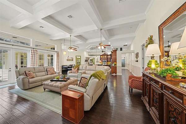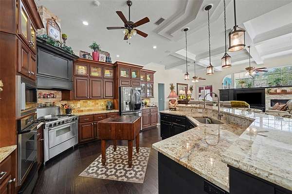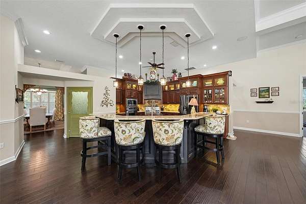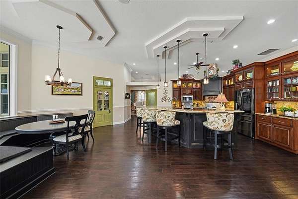 - Built-In Features, Ceiling Fans(s), Central Vaccum, Coffered Ceiling(s), Crown Molding, Eat-In Kitchen, High Ceilings, Primary Bedroom Main Floor, Solid Wood Cabinets, Split Bedroom, Stone Counters, Tray Ceiling(s), Walk-In Closet(s)