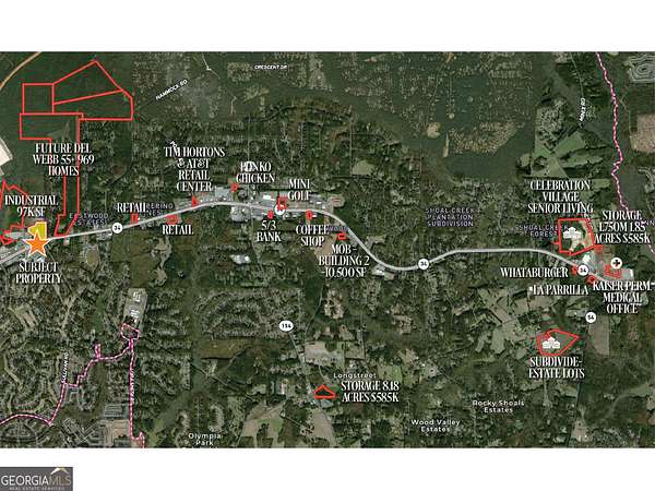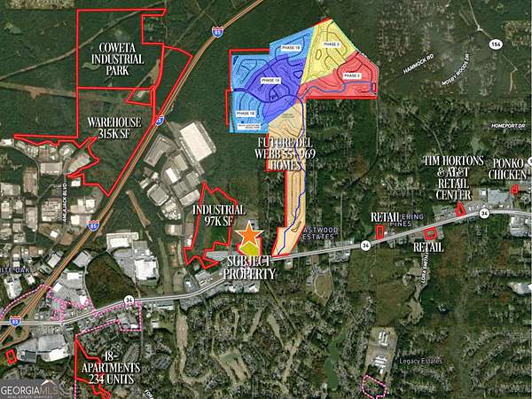 COWETA COUNTY- HWY 34! Attention Developers of Active Adult/Senior Apartments and Senior Housing with care services! Prime 14.5-Acre development site along GA-34 East, Newnan. One of Coweta County's most sought-after corridors, positioned 0.2 miles or one minute-from the recently approved Del Webb by Pulte master-planned 55+community. The parcel features two distinct zoning designations: 11.71 acres zoned -Residential Retirement Care - allowing up to 12 units per acre (totaling 140 units) for any combination of Active Adult (55+), Independent, Assisted Living, and/or Memory Care. A 55-foot height variance further enhances development flexibility. Plus, 2.96 acres zoned Commercial-6 (C-6), permitting a variety of uses within the Commercial Minor Shopping District ideal for retail or service-oriented businesses. This site offers an exceptional opportunity to capitalize on surrounding growth, future demand and scarcity of entitled land. All utilities are available at the street. Located less than two miles from Exit 47 (Bullsboro Drive/GA-34/Newnan Crossing Boulevard) and 25 minutes southwest of Hartsfield-Jackson Atlanta International Airport, the site offers excellent accessibility, strong visibility, and proximity to major transportation routes.The site located between Hollz Parkway and Chatsworth Place with sign on property. Offering Memorandum available to qualified purchasers upon request.