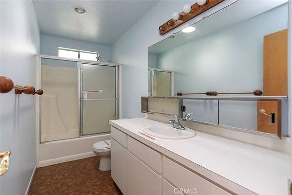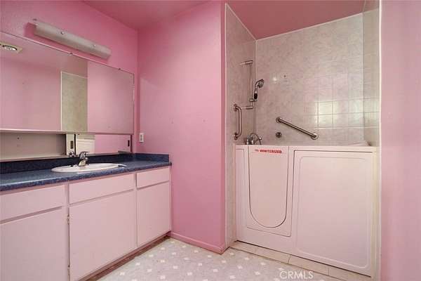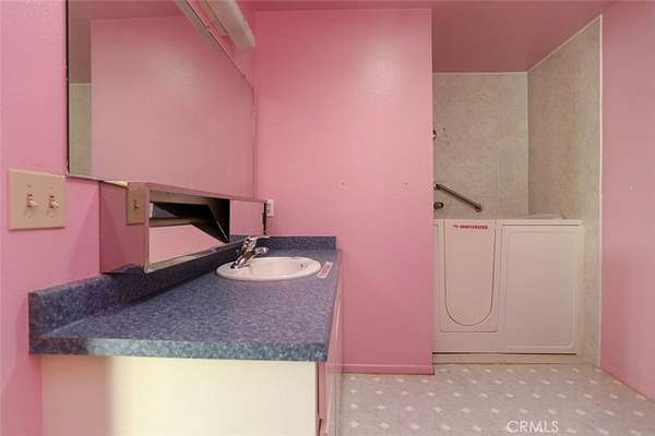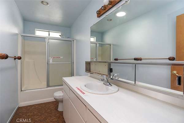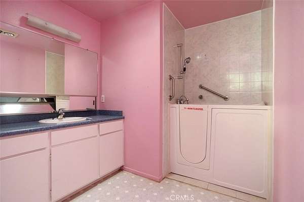 One bedroom includes a built-in bookshelf and does not have a closet. The spacious primary bedroom offers generous closet space, and the primary bathroom features a walk-in tub/shower combination.