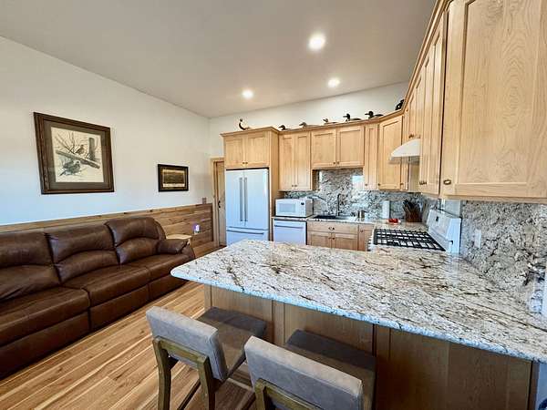 The property is highlighted by a 30x40 foot Barndominium that was built in 2024. It includes 600 square feet of finished living space. It has 1 bedroom and 1 bathroom along with a large walk-in closet. The bathroom has an Onyx shower along with an Onyx vanity top. The kitchen area is built to perfection, with high end finishes such as granite countertops and backsplash, maple cabinets, and stainless steel appliances.