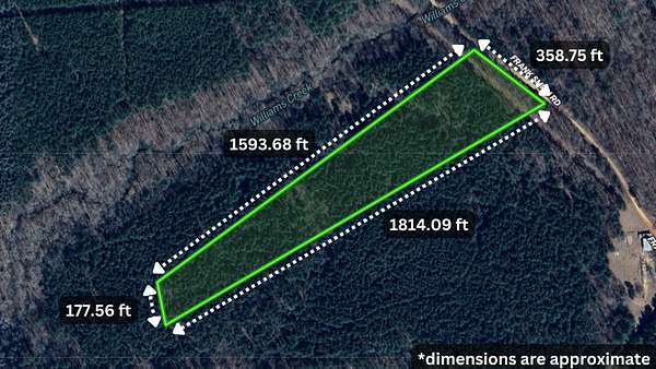 The property features county-maintained dirt road frontage on Frank Smith Road with wooded rolling topography, mature pines (great site index), and a seasonal creek. Electricity is available nearby, while well installation and septic system are required. A soil test has been completed showing approval for conventional septic system installation.