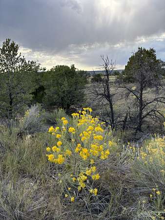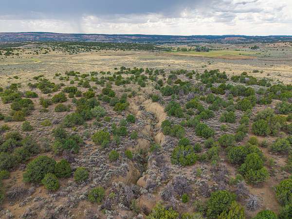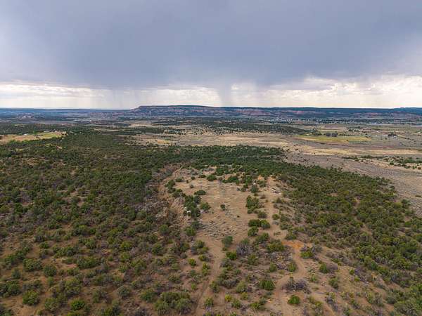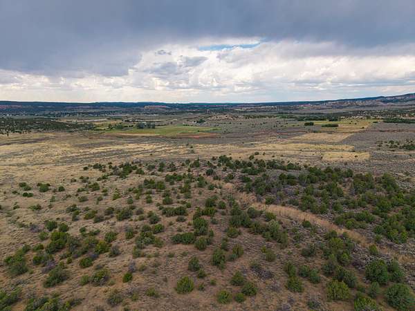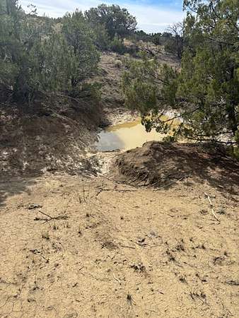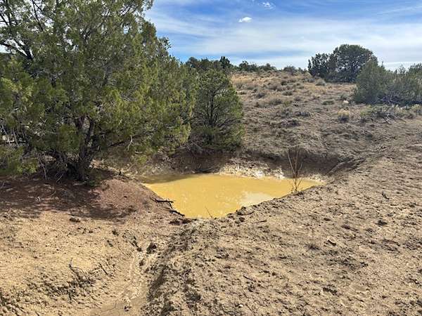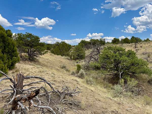 The landscape is primarily covered in healthy pinon-juniper woodland, with a few acres of open pasture near the road. Two narrow arroyos run through the property--one of which includes a newly constructed dirt tank that enhances wildlife habitat and seasonal water collection. Elevation sits at approximately 7,160 feet.