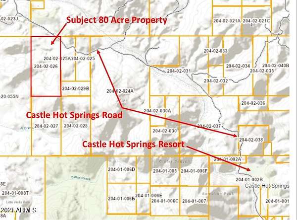 Lake Pleasant's West entrance, continue North past lake to Castle Hot Springs resort. From the resort, go about 2 more miles to the property which lies immediately South of the corral & cow chute.