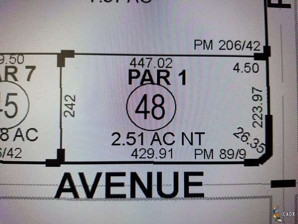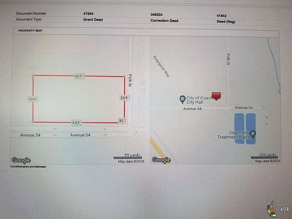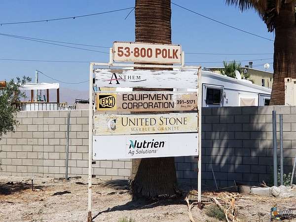 Est $5,563/moCoachella, Ca. 2.51 acres More or Less located in the City of Coachella at the Northwest Corner of Avenue 54 & Polk Street. Zoned M-H. Many variable uses within this zoning. Utilities at the propety line and within the street. Located close to the Coachella Civic Center and Corporate yard at the street to the West (Enterprise Way). Close to Hwy 111 and Southern Pacific Railroad to the West & Hwy 86 to the East. APN 763-141-048. Property Sold "As-Is". Seller and/or agents make no warranties except as to Title. Buyer to do their own due diligence to satisfy themselves.