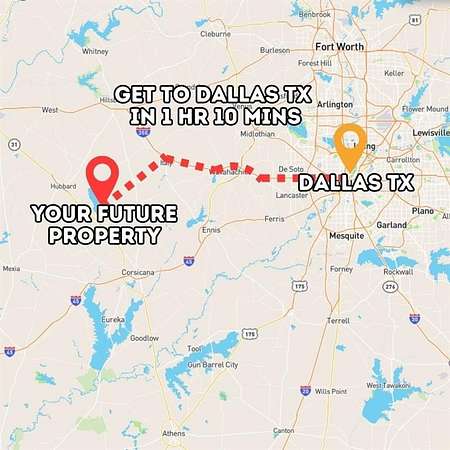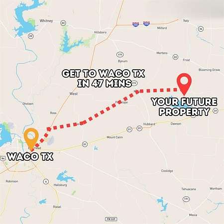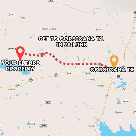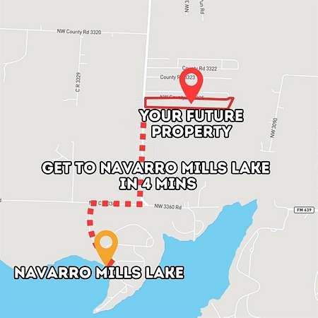 From Navarro Mills Lake, take Watson Road to FM 709 E for 1.8 miles, then follow TX-31 E-State Hwy 31 W and FM667 for 13 miles. Continue on FM1578 and drive 1.7 miles to NW County Road 3325, where the property is located.