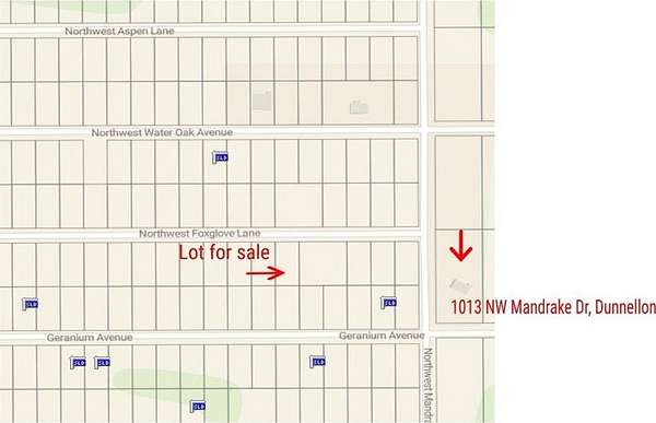 From Dunnellon head North on US-41N, go past Rainbow Springs State Park. Turn left (West) onto SW Rainbow Lakes Blvd. Turn right (North) onto SW Zinnia Ct. Turn left (West) onto SW Marine Blvd. Turn right (North) onto Breezy Pt Drive. Turn Left (West) onto Indian Hill Drive. Turn right (North) onto SW Fig Tree Lane. Turn left (West) onto Mallard Ave. Turn right (North) onto NW Mandrake Drive. Turn left (West) onto NW Foxglove Lane, lot will be on your left with sign. You can use address 1013 NW Mandrake Dr., Dunnellon for your GPS to get close, then go past the address and turn onto NW Foxglove Lane.