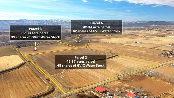Est $3,063/moLot 4 42.34 acre parcel with 42 shares of GVIC Water Stock Lot 2 45.37 acre parcel with 45 shares of GVIC Water Stock Lot 3 39.33 acre parcel with 39 shares of GVIC Water Stock Combination of gated pipe and siphon tubes for irrigation system. Great views in every direction, good farm ground and located just a few minutes from Fruita. For those that are wanting the rural lifestyle and enough land to be able to raise livestock, grow feed and have your own homestead. Close enough to Fruita but far enough away that you are " in the country"
