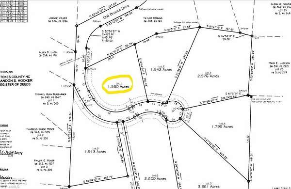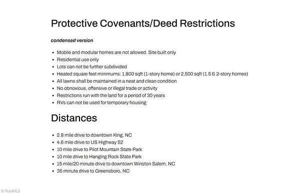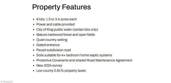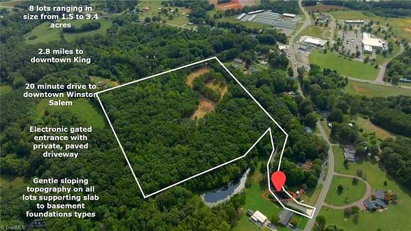 1.5-acre Lot #1 in Oak Brooke subdivision, a new gated community just outside King (Stokes County, NC). This lot enjoys a private, 1,400-foot paved shared driveway serving 8 residential lots. Gentle slopes allow for slab, crawl, or basement builds. Utilities ready: power and cable available. Soils will support a 5-bedroom septic system. Minimal covenants: 1,800 sqft minimum for 1-story site-built homes, no required start date, choose your builder. Shared road maintenance agreement in place. Only 2.8 miles from downtown King, 20 minutes to Winston Salem. Agent owned. Visit listing agent's site for details, attachments, and video tour