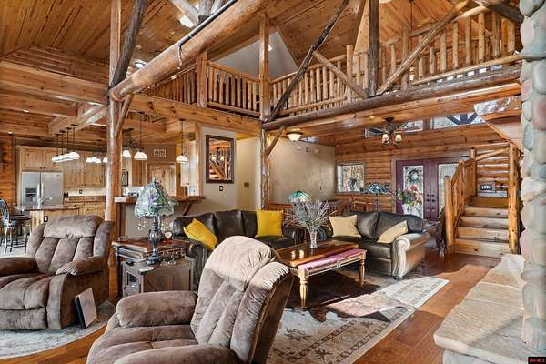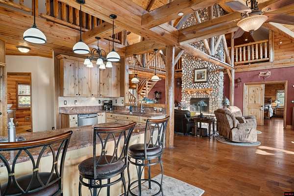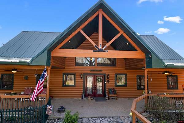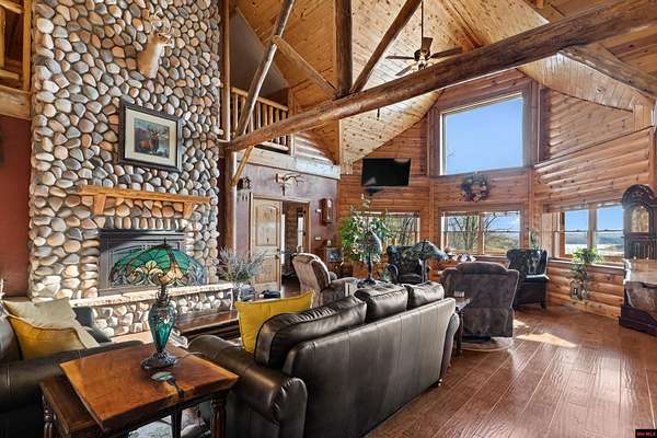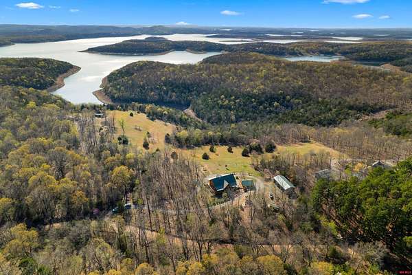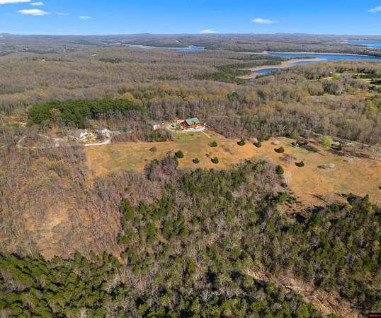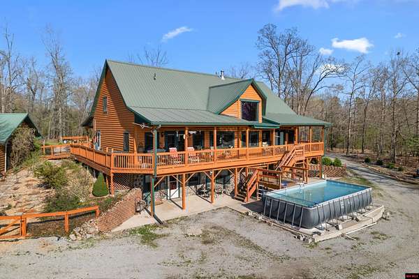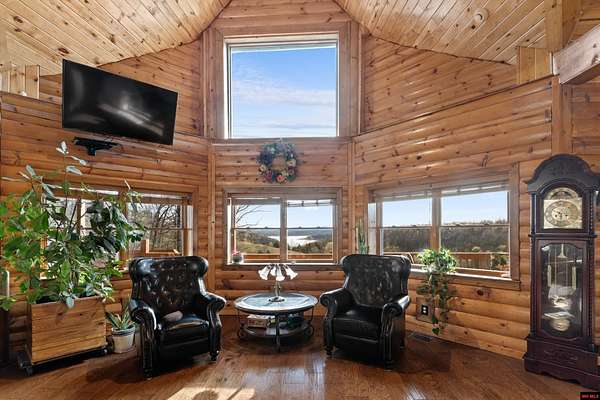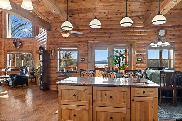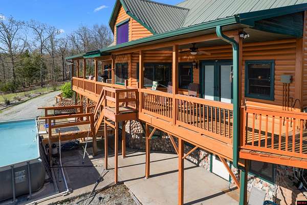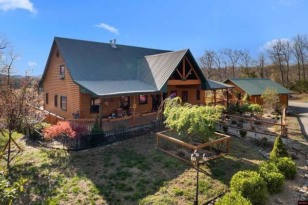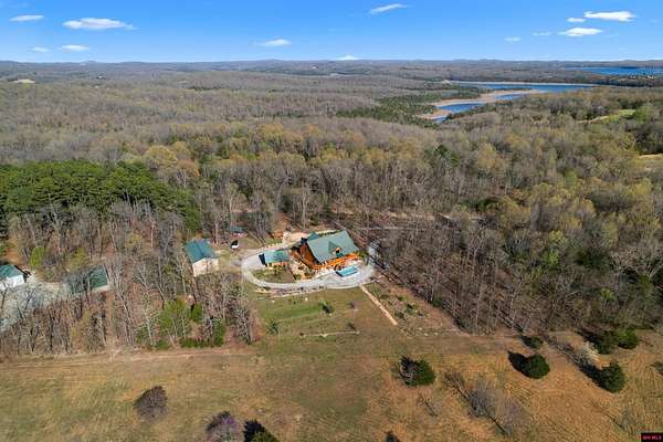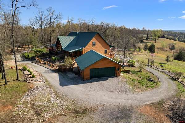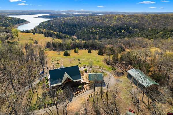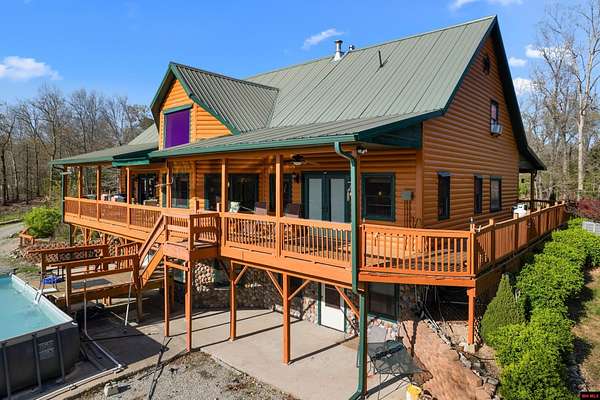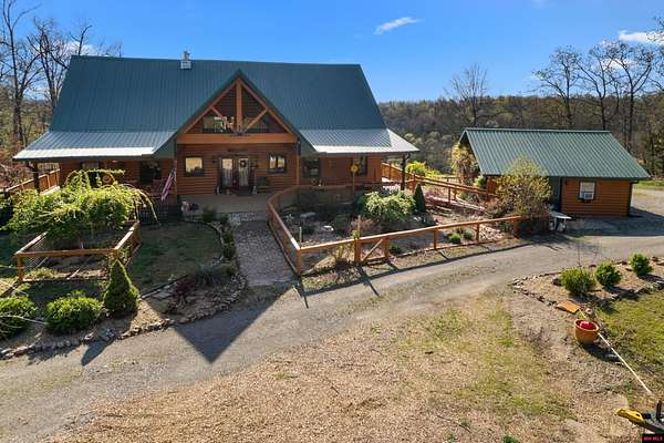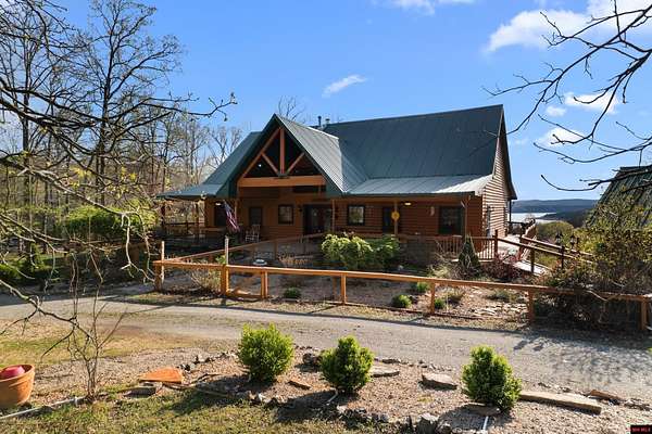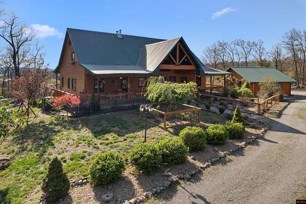 No expense was spared in this stunning 3/4 bedroom, 3 bath open-concept log home located in Oakland that boosts a wrap-a-round porch with year around view of Bull Shoals Lake. Constructed in 2018, this home is situated on 10 AC M/L that border corps property. Don't overlook the impressive 25' rock dual-sided fireplace in the living room, as well as the cozy movie room downstairs. The home features durable 12" ICF walls, a fire sprinkler system, and a safe room for your comfort and safety. The kitchen boasts granite countertops, alder cabinets, a large island, and a pantry. The primary bath includes a stone walk-in shower and a luxurious jacuzzi tub. Outside, you'll discover a detached two-car garage, a 30 x 60 shop, a spacious carport, 12 x 30 pool and a fruit orchard. Downstairs, there's an additional family/rec room complete with a wood-burning fireplace, wet bar, and plenty of storage space. Both association water and well water are available.