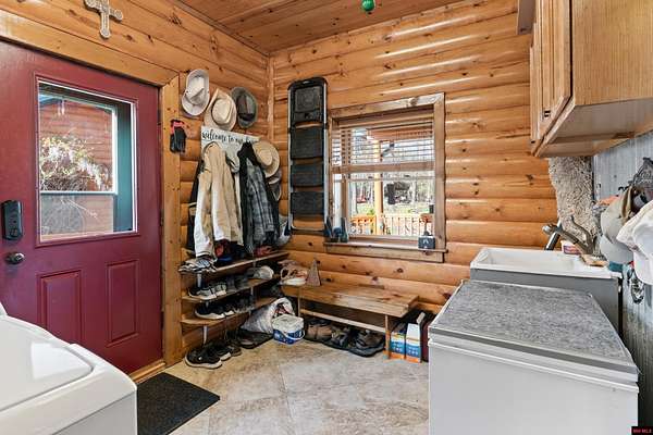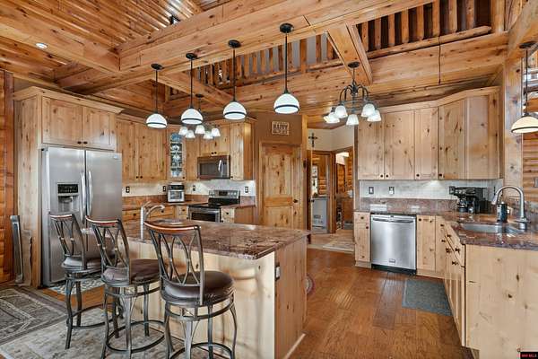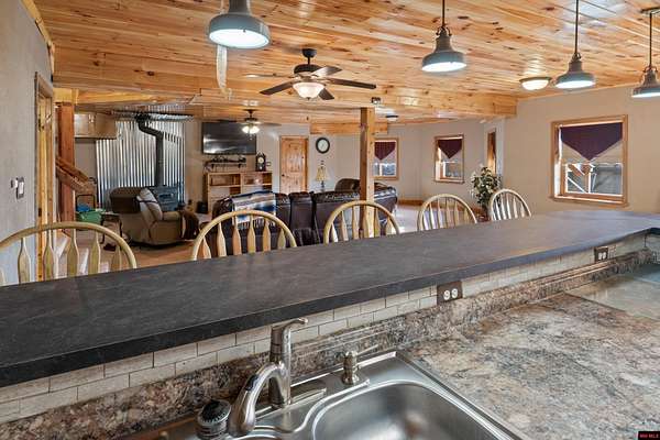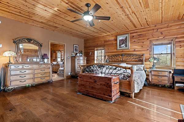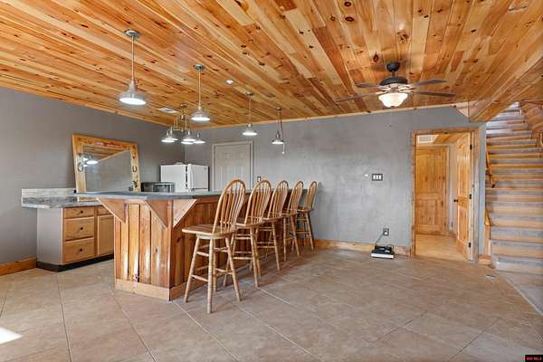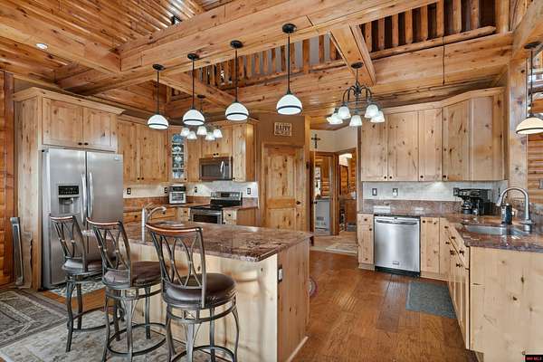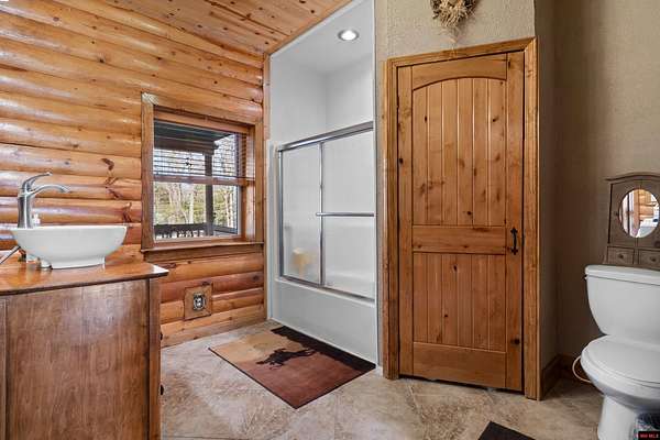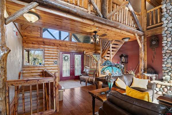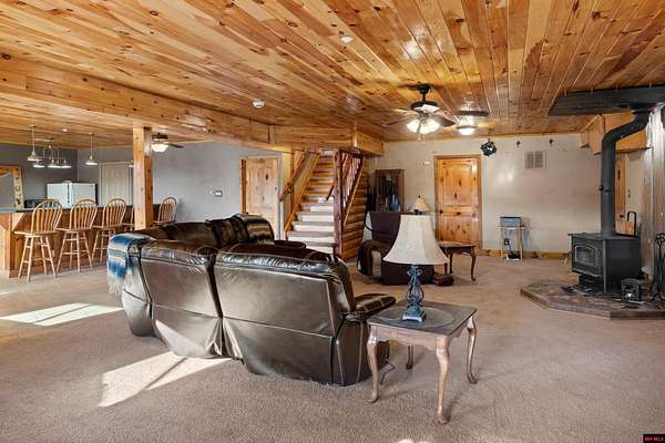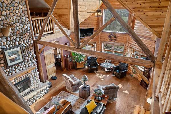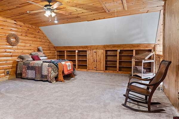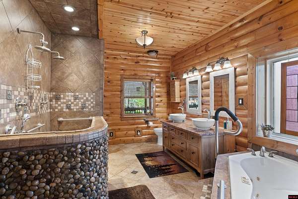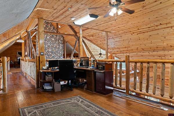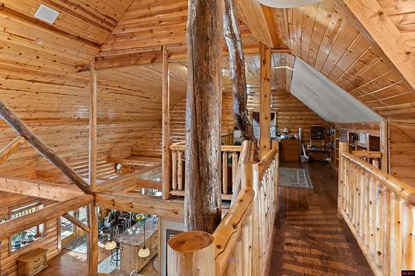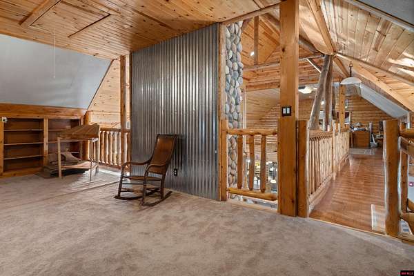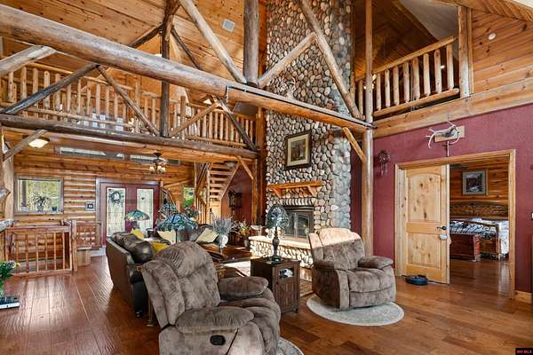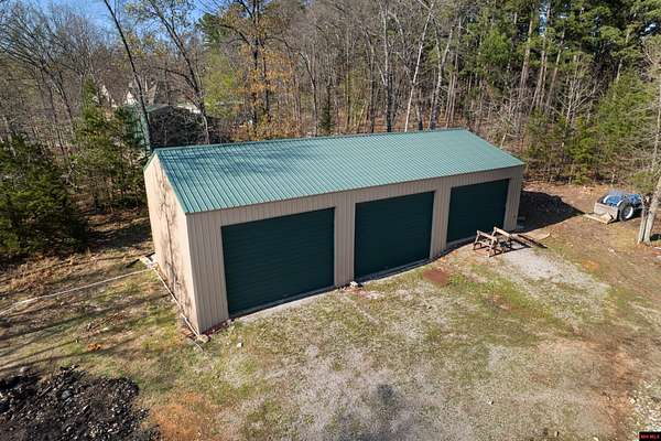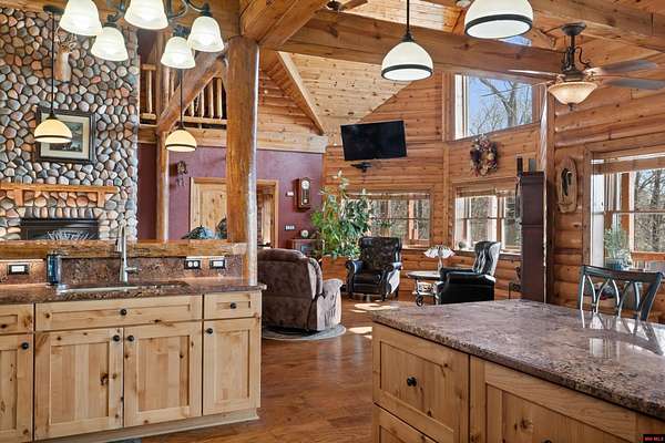 No expense was spared in this stunning 3/4 bedroom, 3 bath open-concept log home located in Oakland that boosts a wrap-a-round porch with year around view of Bull Shoals Lake. Constructed in 2018, this home is situated on 10 AC M/L that border corps property. Don't overlook the impressive 25' rock dual-sided fireplace in the living room, as well as the cozy movie room downstairs. The home features durable 12" ICF walls, a fire sprinkler system, and a safe room for your comfort and safety. The kitchen boasts granite countertops, alder cabinets, a large island, and a pantry. The primary bath includes a stone walk-in shower and a luxurious jacuzzi tub. Outside, you'll discover a detached two-car garage, a 30 x 60 shop, a spacious carport, 12 x 30 pool and a fruit orchard. Downstairs, there's an additional family/rec room complete with a wood-burning fireplace, wet bar, and plenty of storage space. Both association water and well water are available.