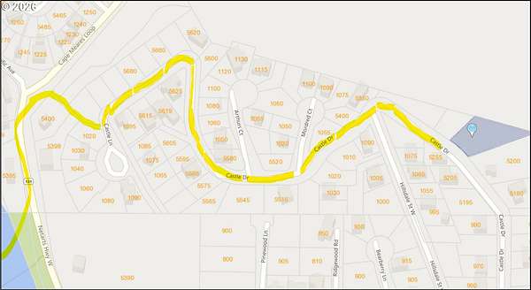 Hwy 131, Uphill on Hillsdale to the top, R on Castle to lot on Left