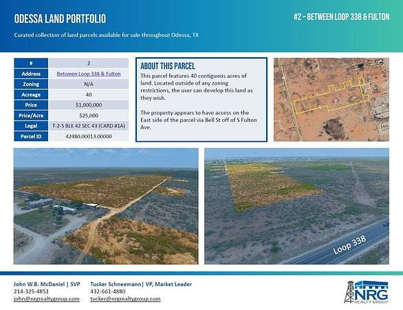 Est $8,184/moThis parcel features 40 contiguous acres of land. Located outside of any zoning restrictions, the user can develop this land as they wish. The property appears to have access on the East side of the parcel via Bell St off of S Fulton Ave.