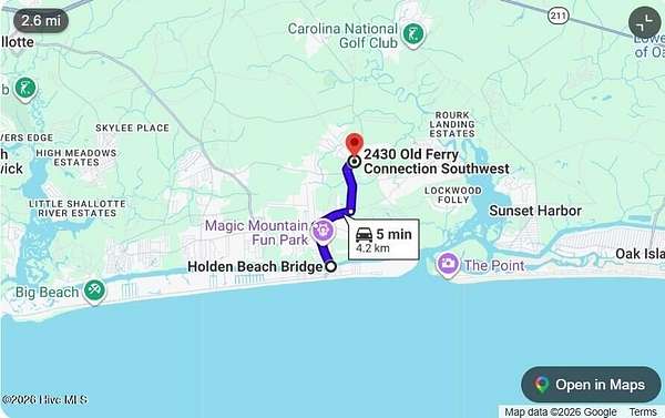 From Holden Beach Bridge, Intracoastal Waterway, Holden Beach, NC 28462 to Old Ferry Connection SW, Supply, NC 28462 5 min (2.6 miles) Turn right onto Sabbath Home Rd SW 0.7 mi Turn left onto Old Ferry Connection SW 1.0 mile Destination will be on the right