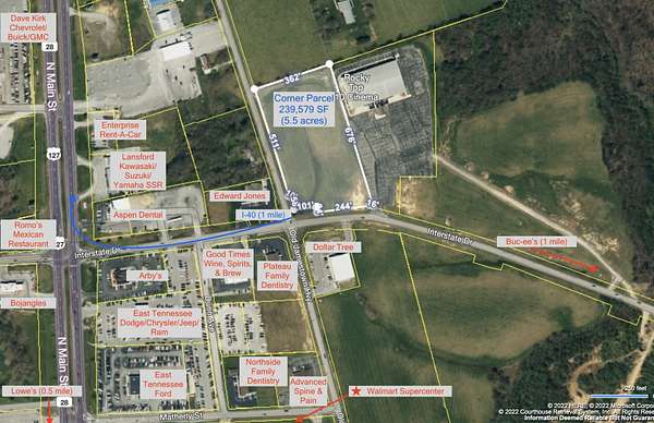 From I-40, take the Crossville exit (Exit #317); turn south onto Main St; turn left onto Interstate Dr; property is on the northeast corner of the intersection of Old Jamestown Hwy and Interstate Drive.