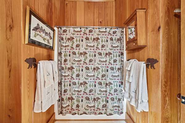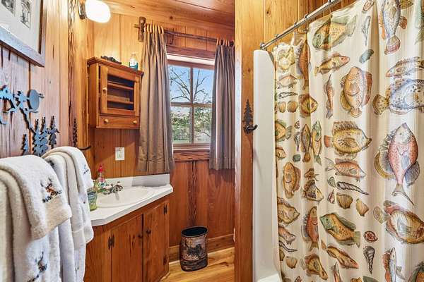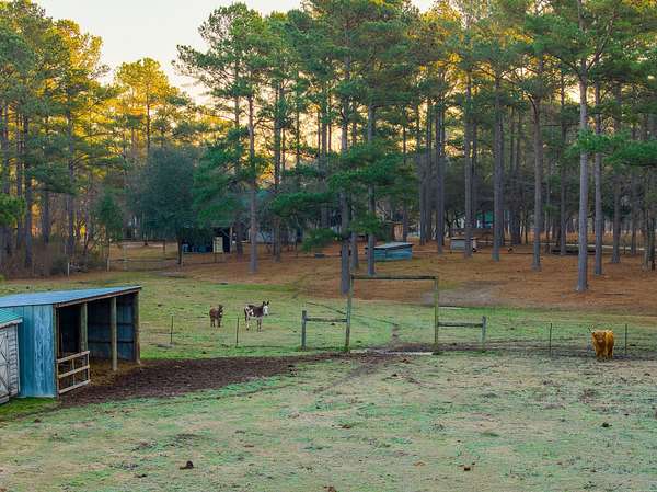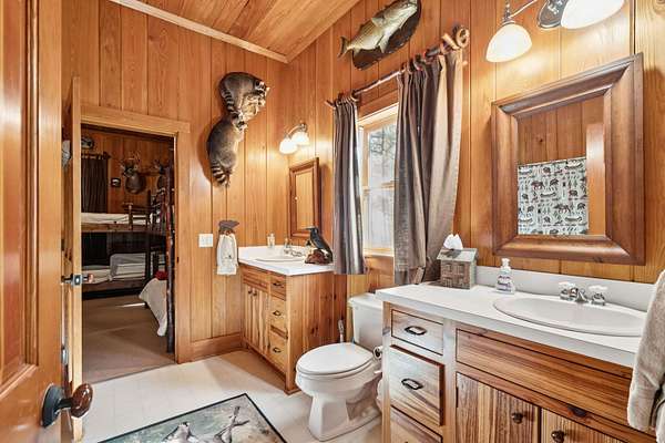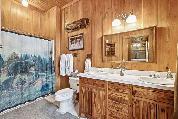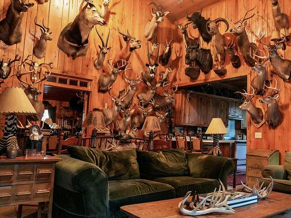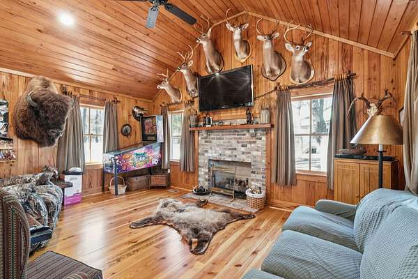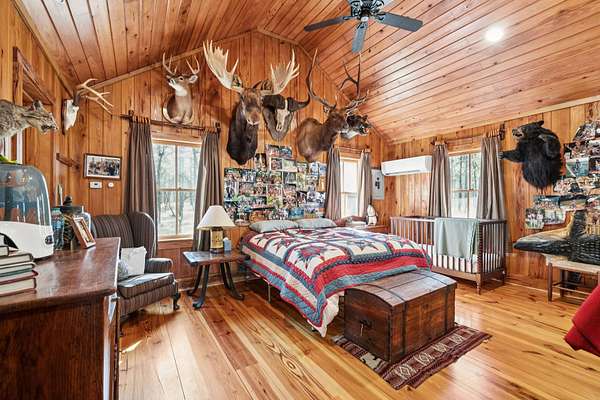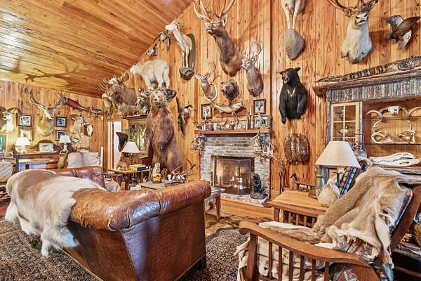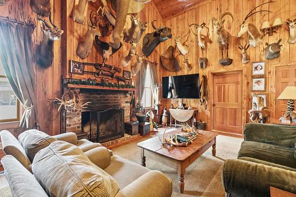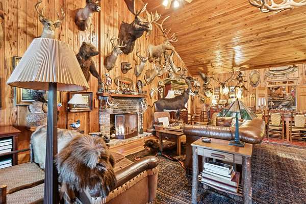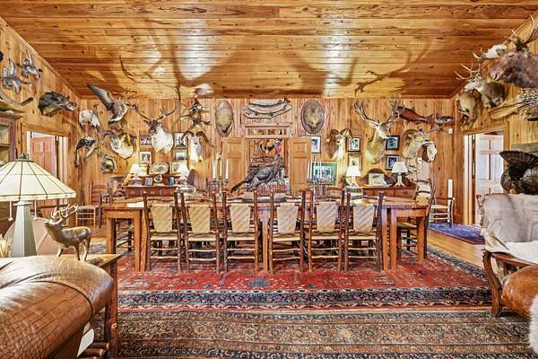 The main drive spans just over 2 miles from the National Forest gate to the main lodge, which sits on a hill overlooking an 18-acre stocked lake. This 3,666 sq ft frame was designed for gathering and entertaining, featuring 18-foot vaulted ceilings, a large den and kitchen, and a focal point: the main dining room and living space. The living area includes two fireplaces, plus four adjoining bedrooms, and three bathrooms.