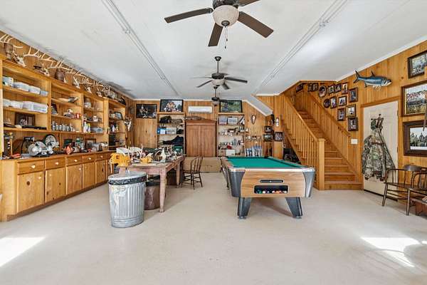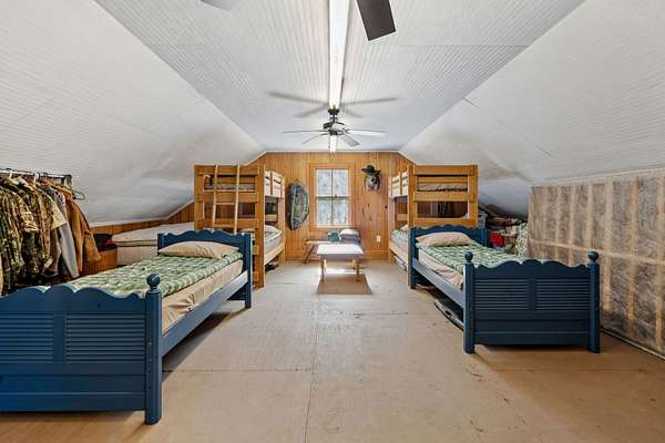 The large 2-story bunkhouse provides additional guest space. Its 870 sq ft layout includes an open ground-floor gameroom and a second-floor bunk room in a large open loft. An additional 865 sq ft of lean-to on three sides is perfect for sheltering side-by-sides and equipment.