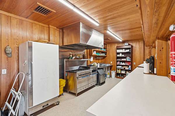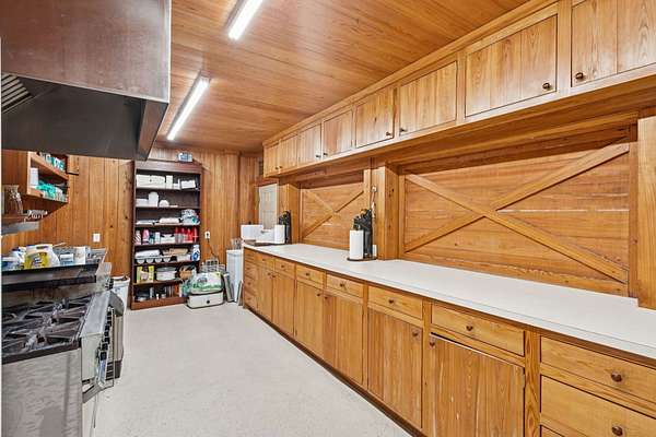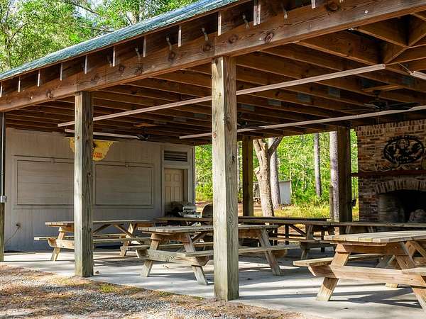 The cook shed features a 1,119 sq ft covered pavilion on a slab, complete with an enclosed kitchen, stone fireplace, and seating area.