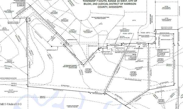 parcel of land being situated in the Northeast 1/4 of the Northeast 1/4 of Sec$on 22, Township 7 South, Range 10 West, City of Biloxi, Second Judicial District of Harrison County, Mississippi and being more par$cularly described as follows: Commencing at a found iron rod at the Southeast corner of Lot 65, The Oaks Subdivision Phase Three; thence run along the South line of said Lot 65 South 89 degrees 43 minutes 36 seconds West 131.45 feet to a found iron rod on the East right-of-way of Oleander Lane; thence run along said right-of-way South 00 degrees 12 minutes 21 seconds West 79.89 feet to a concrete monument at Southeast corner of said right-of-way; thence run along said right-ofway South 89 degrees 27 minutes 36 seconds West 39.27 feet to a set iron rod; thence con$nue along said right-ofway South 89 degrees 27 minutes 36 seconds West 109.61 feet to a set iron rod, also being the Point of Beginning of Lot #4; thence run South 27 degrees 25 minutes 35 seconds West 326.44 feet to a set iron rod; thence run North 85 degrees 02 minutes 06 seconds West 88.13 feet to a found iron rod; thence run North 84 degrees 41 minutes 13 seconds West 355.31 feet to a found iron rod; thence run North 00 degrees 55 minutes 12 seconds West 398.30 feet to a found iron rod at the Northeast corner of Lot 11, The Revision of Lots 3 Through 12, Sunkist Manor Subdivision, Unit 6-A; thence run South 88 degrees 18 minutes 59 seconds West 76.46 feet to a found iron rod at the S