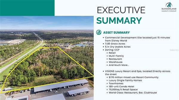 Est $17,969/moCommercial Development Site located just 15 minutes from Disney World. 11.85 Gross Acres. 5.1+- Dry Usable Acres.