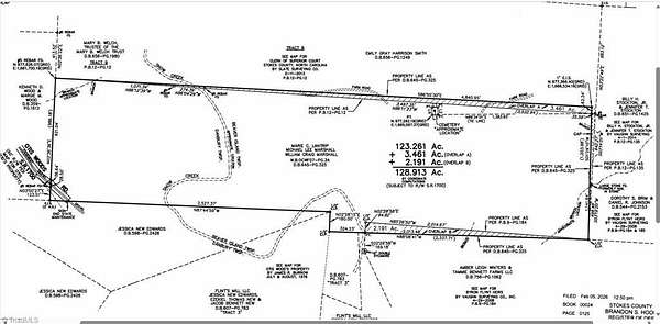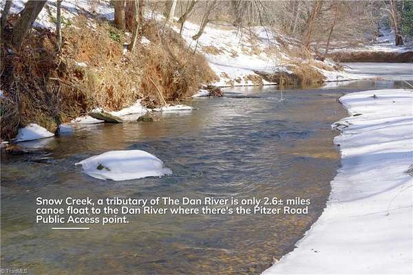 This first time to market 128.9-acre property features double-sided frontage on Snow Creek, a tributary of the Dan River, and a mix of mature and mid-aged hardwood and pine timber. The land offers leaf-off long-range views, giant rock outcrops, and 8+ foot deep swimming holes along the creek. Snow Creek also provides excellent smallmouth bass fishing and supports deer, turkey, and occasional black bear for hunting. The property includes over 2 miles of established ATV and side-by-side trails and sits just a 2.6+/- mile float from the Dan River and the Pitzer Road Public Access point. A new 2026 survey confirms 128.9 acres with percable soils, no deed restrictions, and subdivision permitted. County property taxes are under $500 per year. Located just 4 miles from Danbury, 6 miles from Hanging Rock State Park, and 34 minutes from Winston-Salem, this tract offers a blend of recreation, privacy, and development potential. Visit Listing Agent's website to access more details and video tour