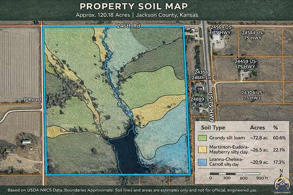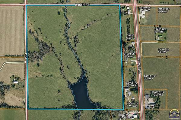 120.18 acres of brome located just north of Holton Kansas; offered for the first time in over 65 years. Located just off US-75 Highway this versatile tract features a live creek feeding into a nearly five acre pond along with cleared open pasture. Predominantly silt loam soils make it ideal for grazing, hay production, or recreational use. Five-wire barbed fencing with three access points on County Road 246 & P Road. This property is set up well for livestock operations or expansion of an existing herd. A great combination of water, usability, and location.