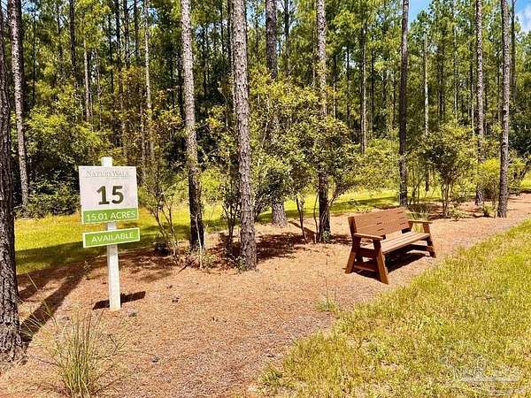 Discover the beauty of NatureWalk at Pond Creek, one of the most prestigious land communities in Northwest Florida. NatureWalk is nestled amidst pine tree forests, lush greenery, scattered oaks, and natural flowing creeks. The idealistic landscape is almost "untouched," providing privacy, peace, and serenity for each lot. Lot 15 is a spacious and private 15-acre parcel situated in the heart of the NatureWalk community, near the beautiful creek and a scenic sitting area. The creek partially flows on the southeast side of this property. Lot 15 primarily offers high and dry areas but also features sections of hardwoods and wetlands sloping towards the creek. There is approximately 1 acre of mulched area designated for the future homesite. ADDITIONAL COMMUNITY INFORMATION: NatureWalk at Pond Creek community was launched in 2023, and since then, this exclusive community has become a place that attracts buyers from all across the United States. The Owner's vision for this community is simple: Quality Family Living Centered Around Nature. Curved and paved roads, a distinctive community layout thoughtfully combined with Northwest Florida's natural beauty, high-end landscape features, common areas set in a scenic natural environment, and high-speed internet are all reasons for that. This unique community is situated on 653 acres of land, comprising 100 lots in total, and features homesites ranging from 2 to 15+ acres, including premium creek-front parcels. As of July 2025, close to 50 out of 100 parcels have been sold. LOCATION: Another aspect that makes this community very special is its location. NatureWalk at Pond Creek is conveniently located within a short drive of Publix, Big-Box stores, restaurants, and hospitals. Our community is centrally located for outdoor enthusiasts: from Blackwater River freshwater fishing and boating to our Gulf Coast, featuring the emerald blue waters of the Gulf of Mexico and beautiful beaches.